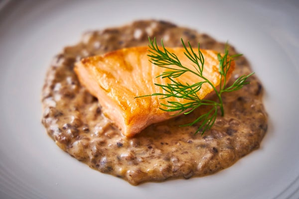 きめ細かく肉厚な身に旨みがギュッと凝縮された信州サーモンを鉄板焼きにしてご提供いたします。豆乳特有の甘みとコクがある優しい味のソースに、きのこの食感とトリュフの香りをプラスした贅沢な一品をお楽しみいただけます。