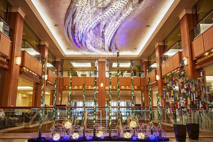当ホテルでは、毎年、七夕の季節に「願いが叶う夏星の祭典~天の川に願いを込めて~」と題した全館フェアを展開しております。今年も、夏の夜空に想いを馳せながら、日本の粋な七夕をお楽しみいただける「七夕ディスプレイ」を、天の川をモチーフにデザインされたロビーシャンデリアの下に設置いたします。