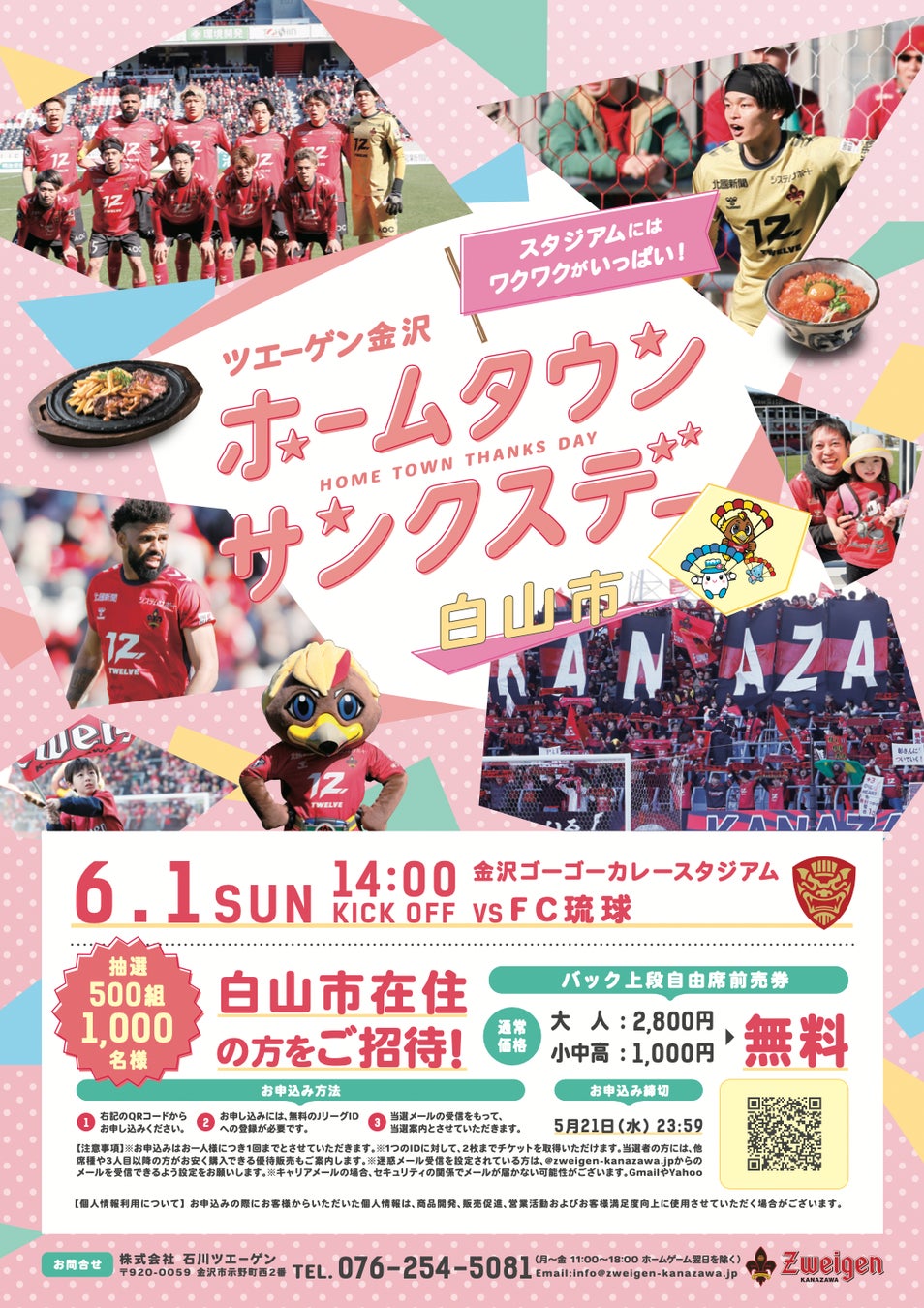 この度、ツエーゲン金沢(J3)は6⽉1⽇(日)FC琉球戦にて開催される「白山市ホームタウンサンクスデー」の告知活動のご⽀援・ご声援をお願いするために、5⽉15⽇(木)に弊社 代表取締役事業統括 端 陽造が白山市役所を表敬訪問いたします。
