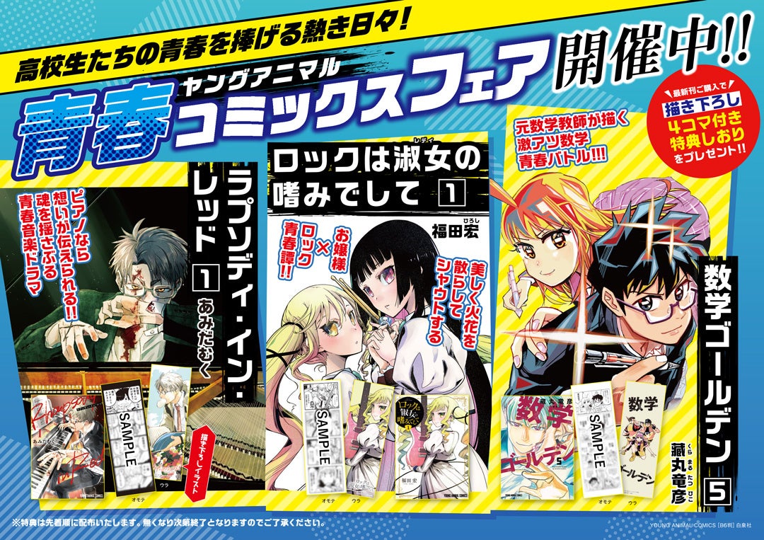 ヤングアニマルコミックスの青春を数学、ロック、ピアノにそれぞれ捧げる高校生たちを描く作品でフェアを実施します!