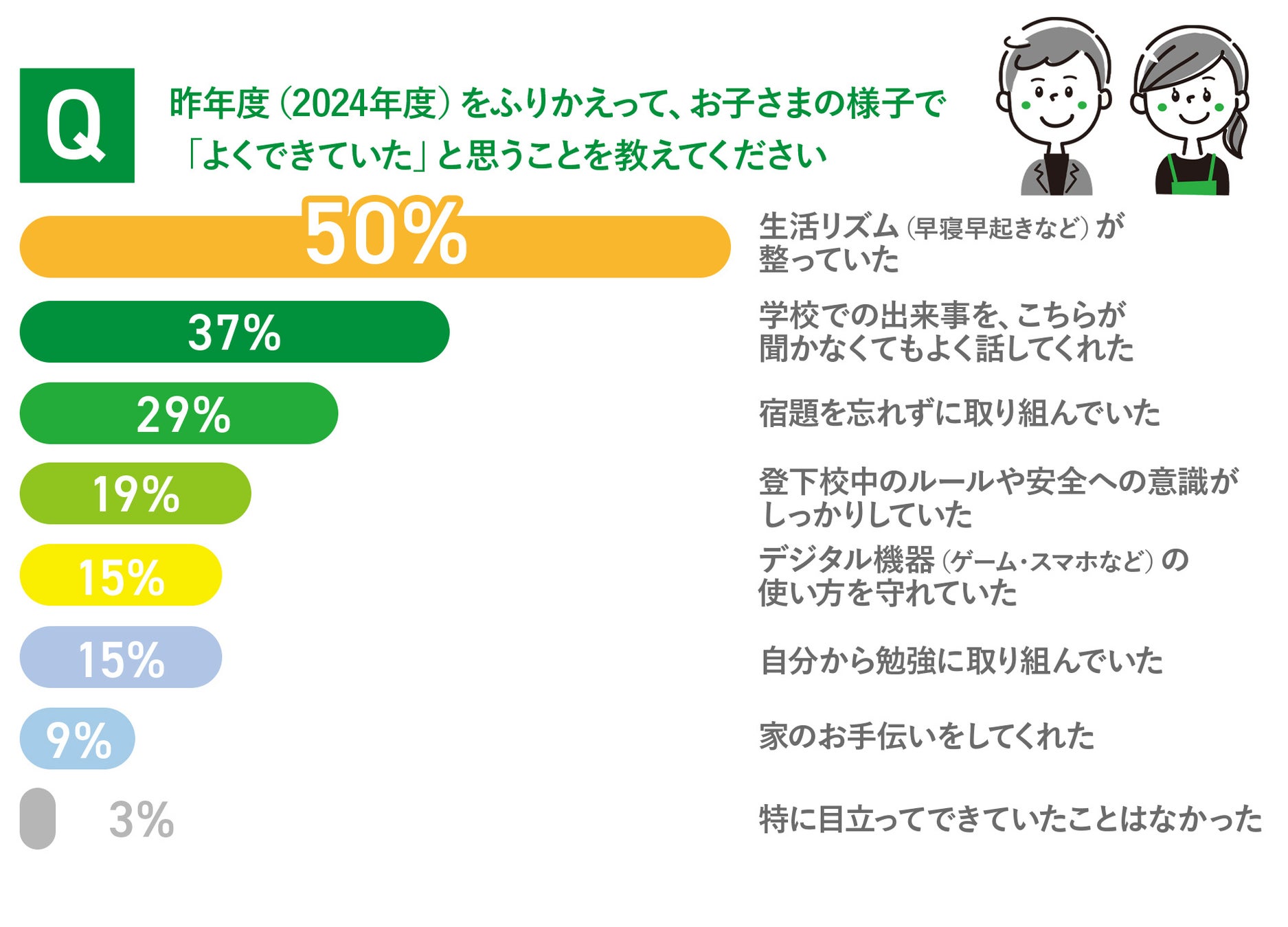 親が昨年度を振り返り、ご自身の子どもが「よくできていた」と感じたこととして最も多かったのは「生活リズムが整っていた(50%)」、次に「学校での出来事を、こちらが聞かなくてもよく話してくれた(37%)」でした。