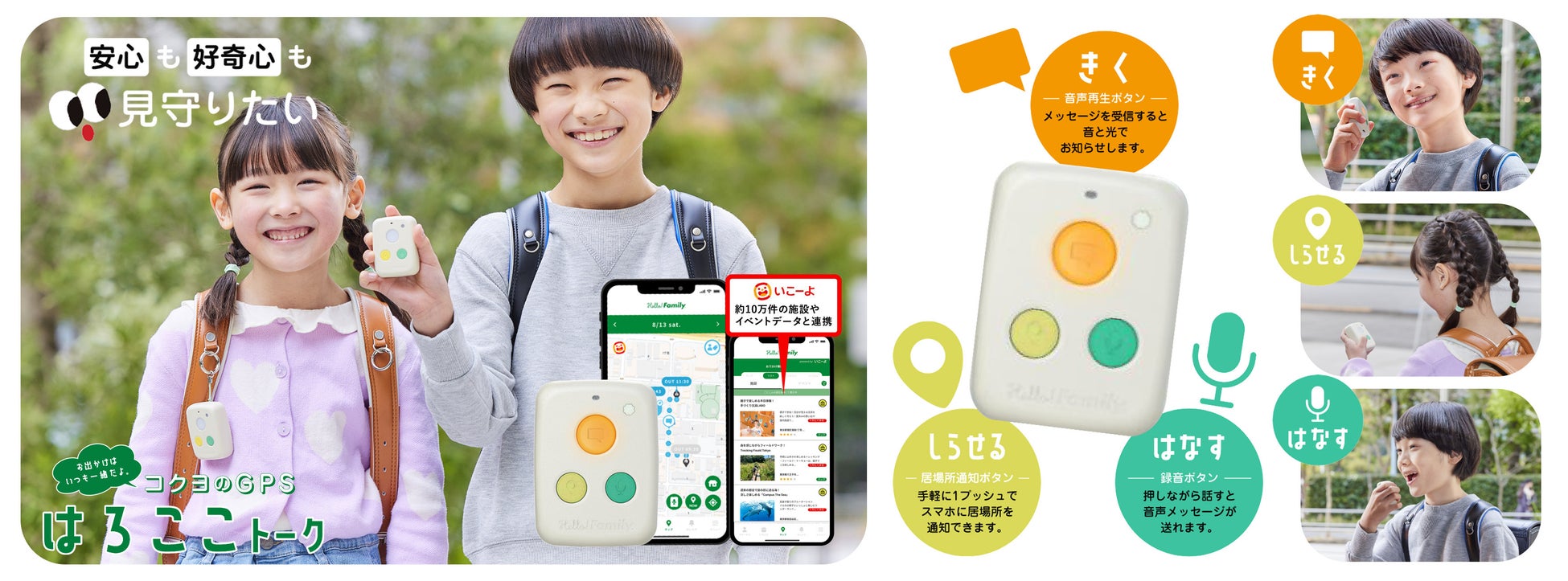 「はろここトーク」は、従来機「はろここ」の位置情報送信機能に加えて、子どもの「音声メッセージ」を簡単に送受信できる機能を搭載した、ワクワク感をコンセプトにした新しい見守り端末です。親が子どもと連絡を取りたいときに役立つだけでなく、兄弟で端末を持っていれば、兄弟同士で音声のやりとりも可能になります。新しい使い方によって、子どもの自立や「できた!」をさらに応援したくなる製品です。