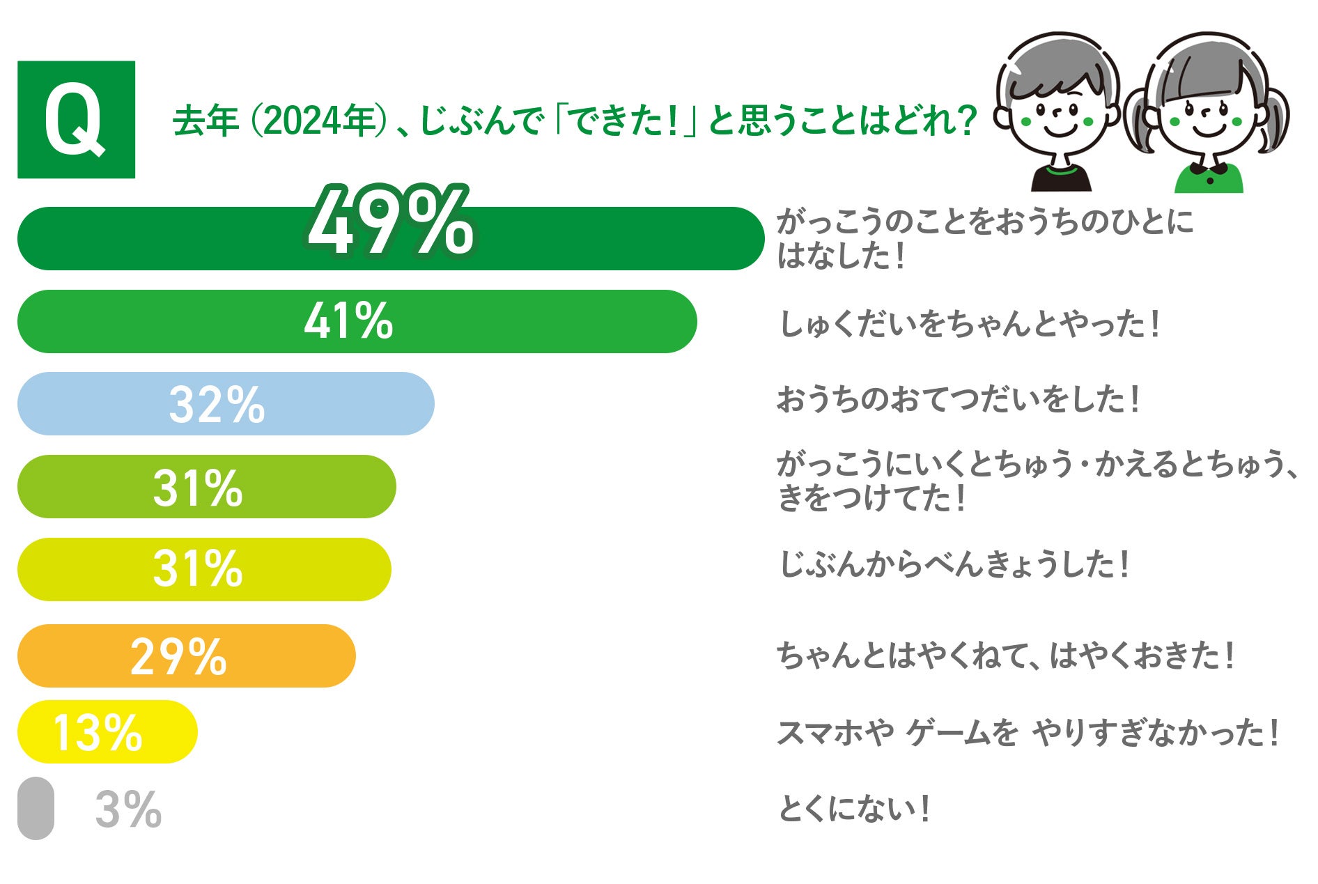 子どもに対し、自分が「できた!」と感じることを質問したところ、「がっこうのことをおうちのひとにはなした!(49%)」が最も多く、次に「しゅくだいをちゃんとやった!(41%)」が多い結果となりました。