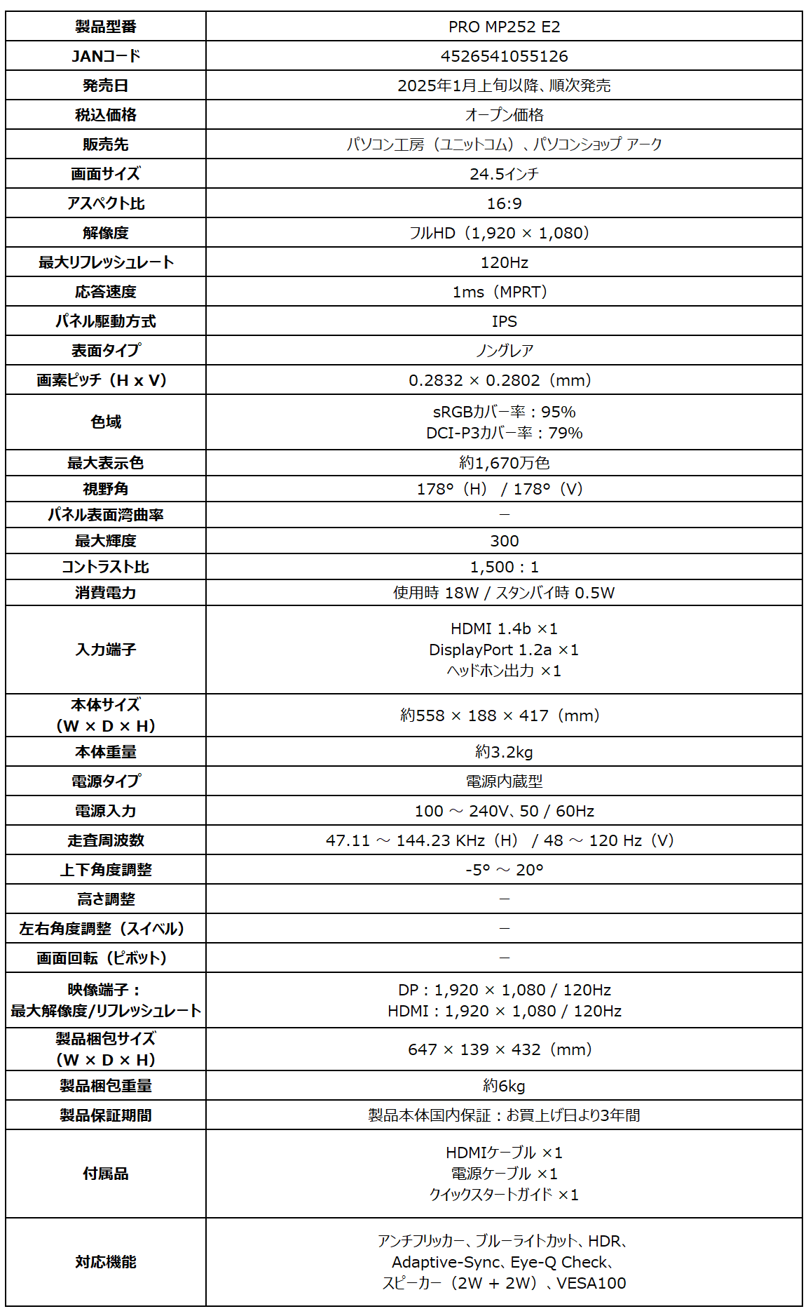 世代を問わずに使用できる目に優しいビジネス向けモニター 24.5インチ・フルHD・IPS・スクロール時も見やすいリフレッシュレート120Hz ユニットコム専売モデル「PRO MP252 E2」発売