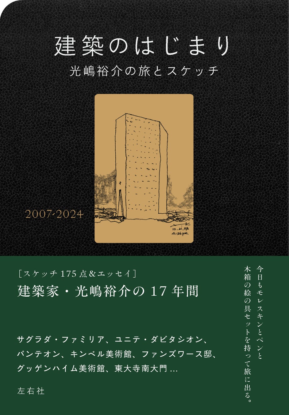 建築家・光嶋裕介が、2007年から2024年までの17年間、旅先で書き溜めた175点のスケッチをまとめた『建築のはじまり』が、左右社より発売されます。オールカラーのスケッチにくわえて、光嶋がそれぞれの建築、土地、街に思いをはせてつづったショートエッセイも収録され、その土地の風景や建物の佇まいが感じられる一冊です。