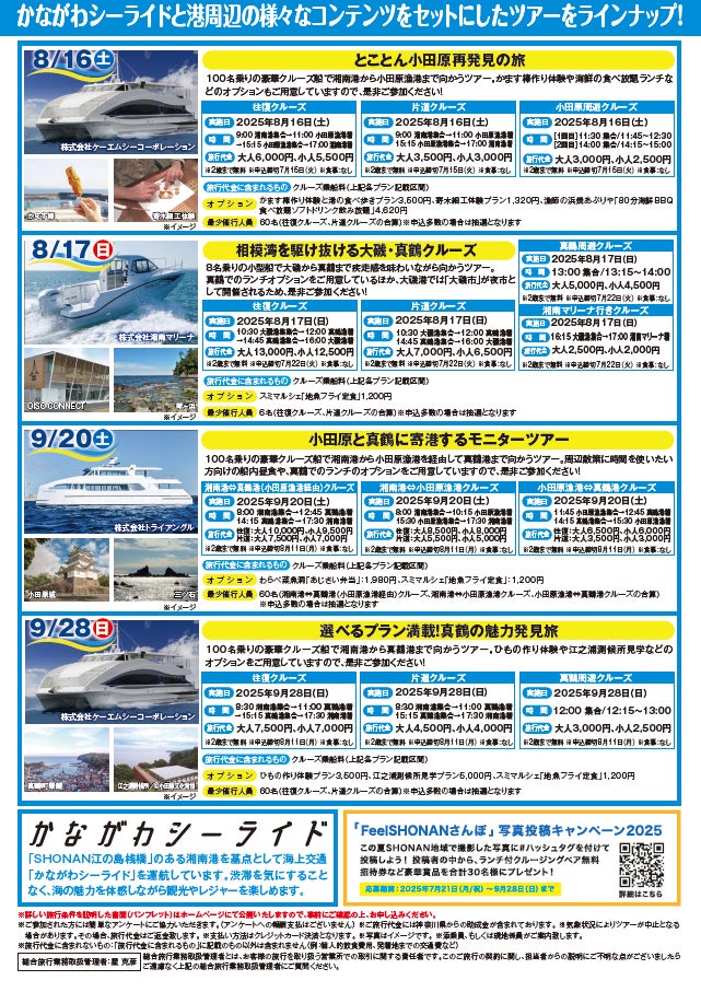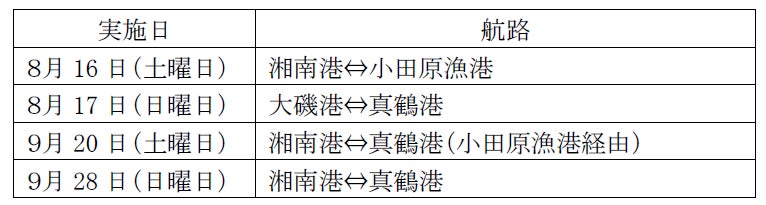湘南港と葉山マリーナや大磯港等を結んでいる海上交通「かながわシーライド」を大磯以西に広げていくため、小田原漁港や真鶴港を活用した実証実験として、モニタークルージングツアー(第1弾)を8月から9月に実施しますので、お知らせします。