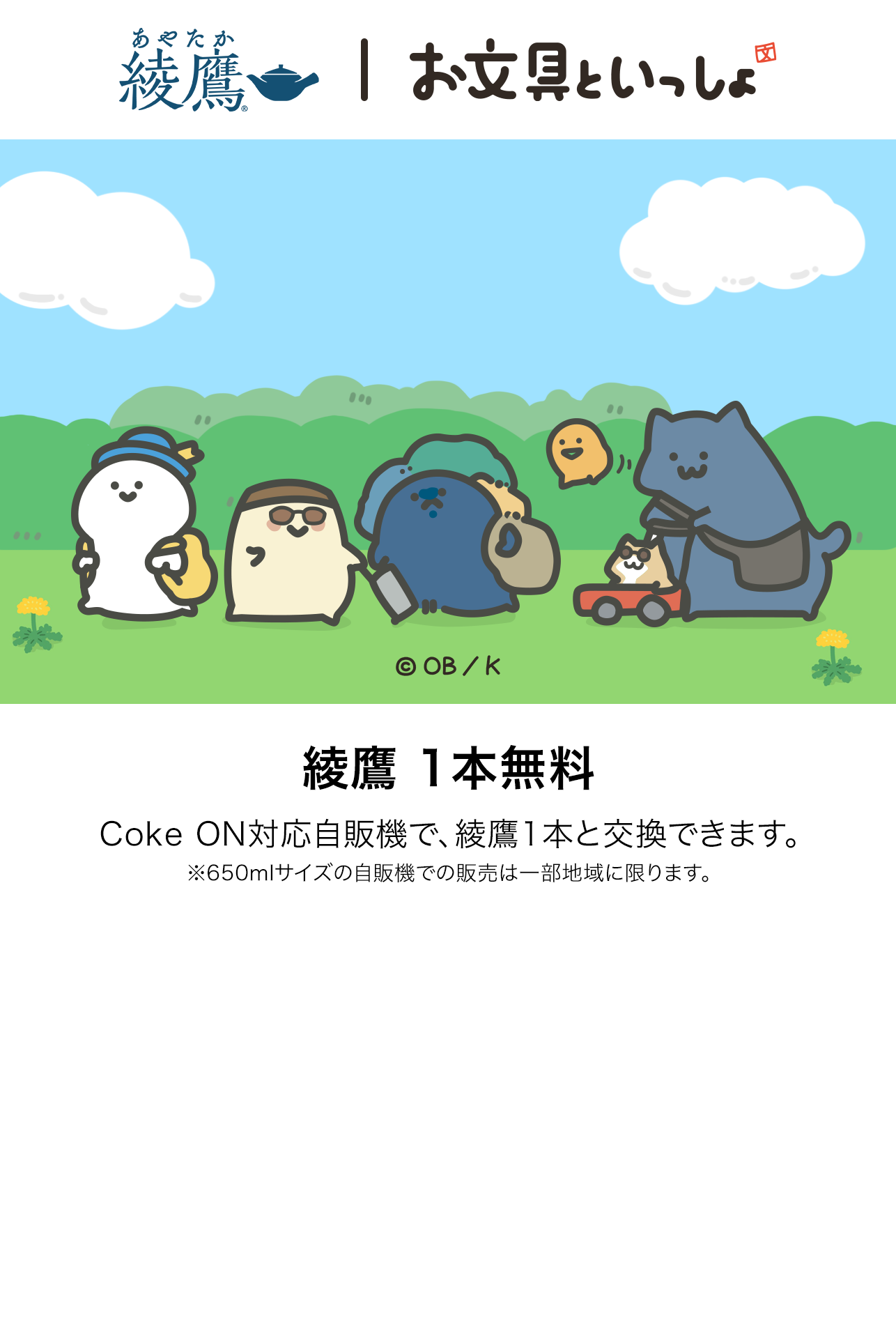 キャンペーン期間中、対象の「綾鷹」製品を購入し、キャップ裏に印字されているコードをコカ・コーラ公式アプリ「Coke ON」で読み込み、または「Coke ON」を自販機に接続して対象の「綾鷹」製品を購入すると獲得できるポイントを使い、賞品に応募できます。応募いただいた方の中から、合計10万名様に「お文具といっしょ」コラボグッズなどが当たります。抽選にはずれた方を対象にW(ダブル)チャンスとして、抽選で110万名様に PayPay ポイント10ポイントが当たります。キャップ裏コード読み込みにより参加された場合は、限定デザイン Coke ONスタンプを同時に獲得できます。さらに、ポイント応募者全員に「綾鷹」と「お文具といっしょ」のオリジナルLINEスタンプをプレゼントします。