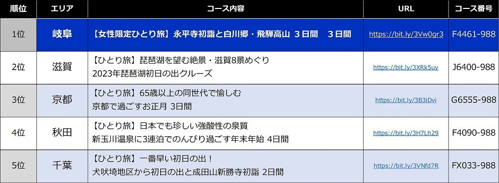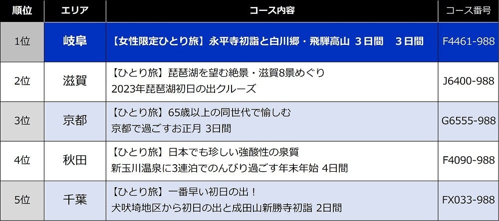 今年の年末年始「ひとり旅」人気コースにおいて1位となったのが、「【女性限定ひとり旅】永平寺初詣と白川郷・飛騨高山 3日間」(https://bit.ly/3Vw0gr3)。お客様はもちろん添乗員も含め全員が女性のおひとり様で、800年の歴史を持つ禅寺の名所「永平寺」を比較的人の少ない朝一番に初詣できるほか、一度は訪れたい「世界遺産・白川郷」や日本海の絶景「東尋坊」を観光でき、飛騨牛すき焼きやズワイガニ、加賀野菜や地元魚介を使用したフレンチコースなど豪華グルメも堪能できることから大変人気のコースとなっています。また、初日の出をテーマにしたコースも人気で、2位は「琵琶湖初日の出クルーズ」、5位は「日本で一番早い!犬吠埼からの初日の出」がランクイン。来年以降も、気軽に参加できるひとり旅の高いニーズは定着するとみています。
