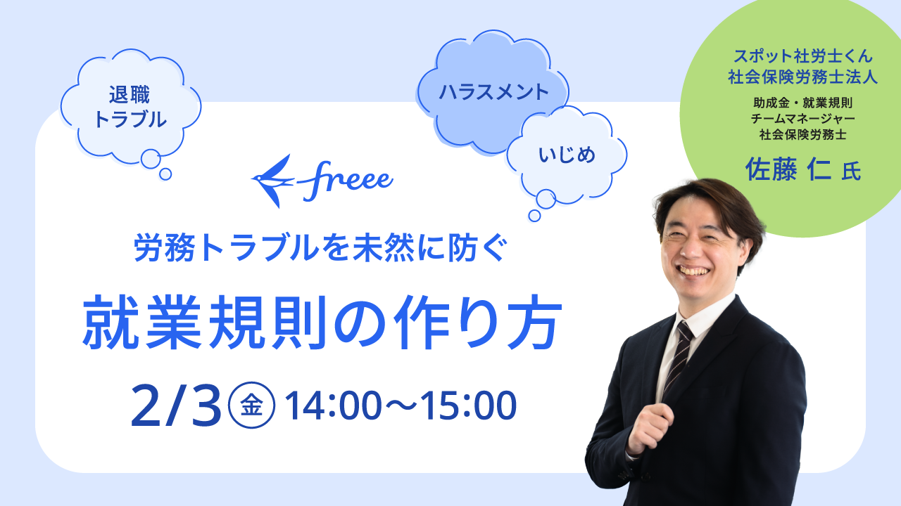 freee人事労務、「労務トラブルを未然に防ぐ就業規則の作り方」セミナーを2月3日(金)14:00~オンライン無料開催