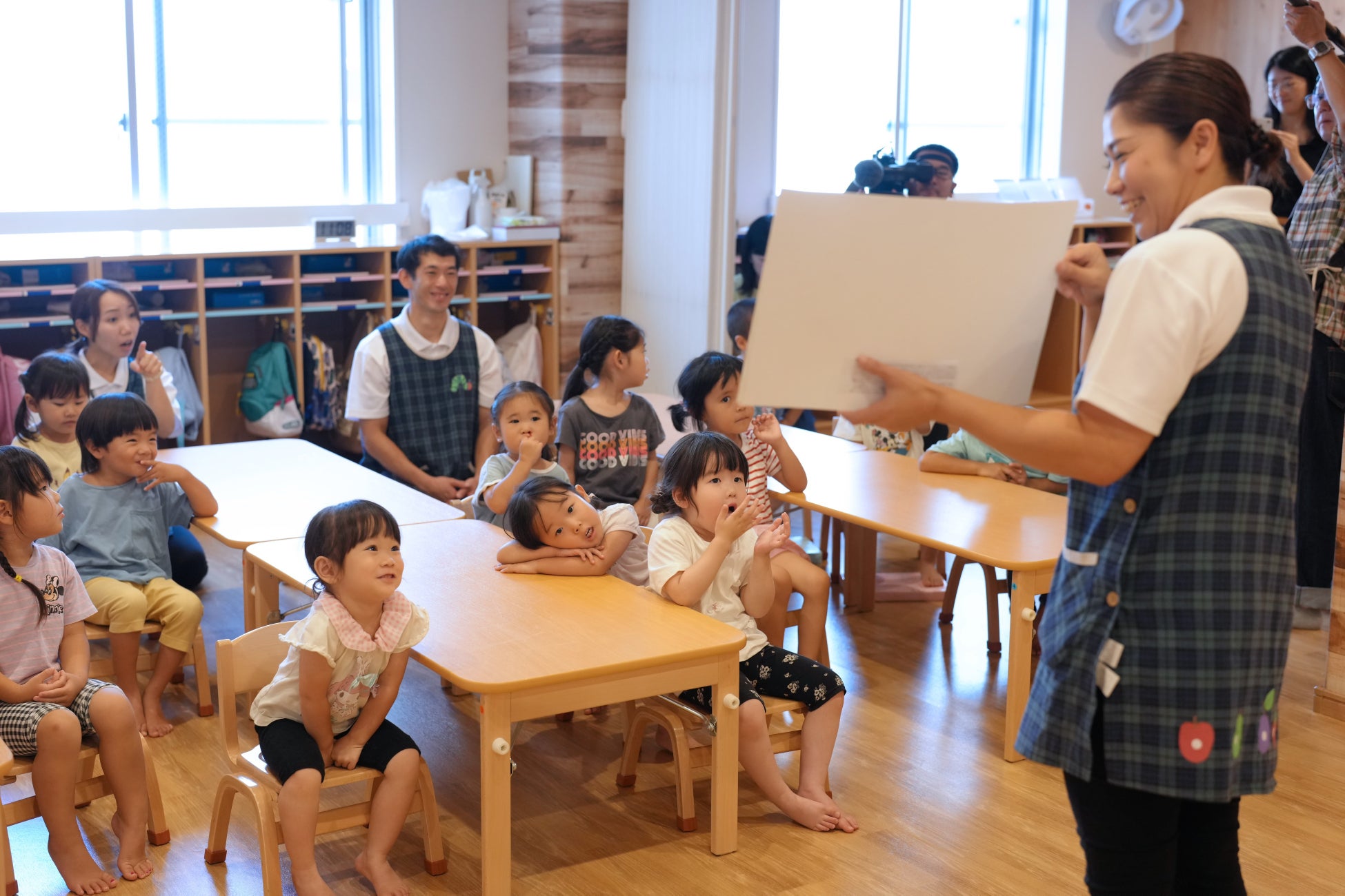 今回の食育プログラム当日、年少~年長クラスの園児たち16名には、まず保育士の先生から、産地や生産者の様子、畑で実っているとうもろこしの画像を使った紙芝居を通して、実際のとうもろこしの苗の大きさや、どんなふうに畑で育っているかを知ってもらいました。