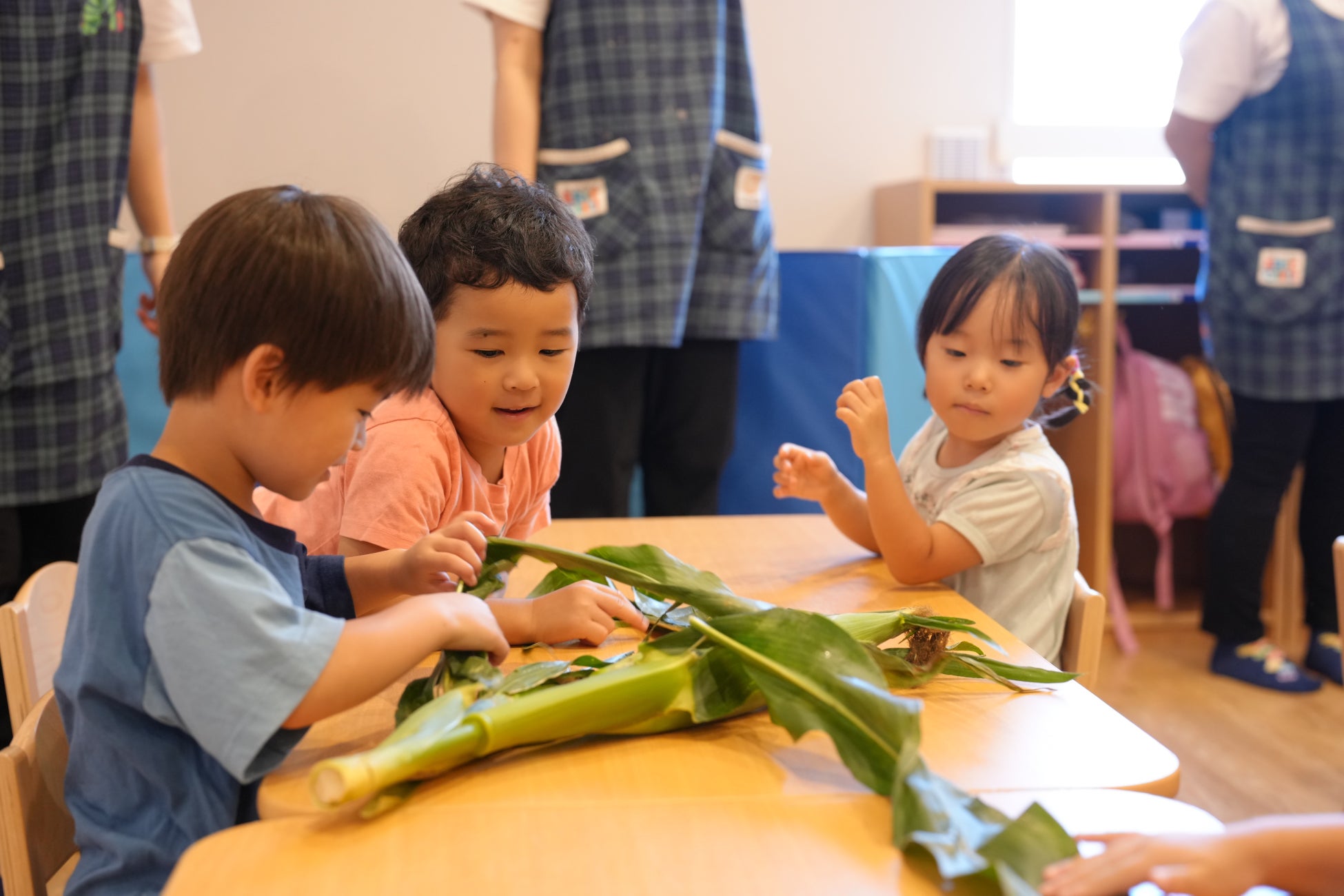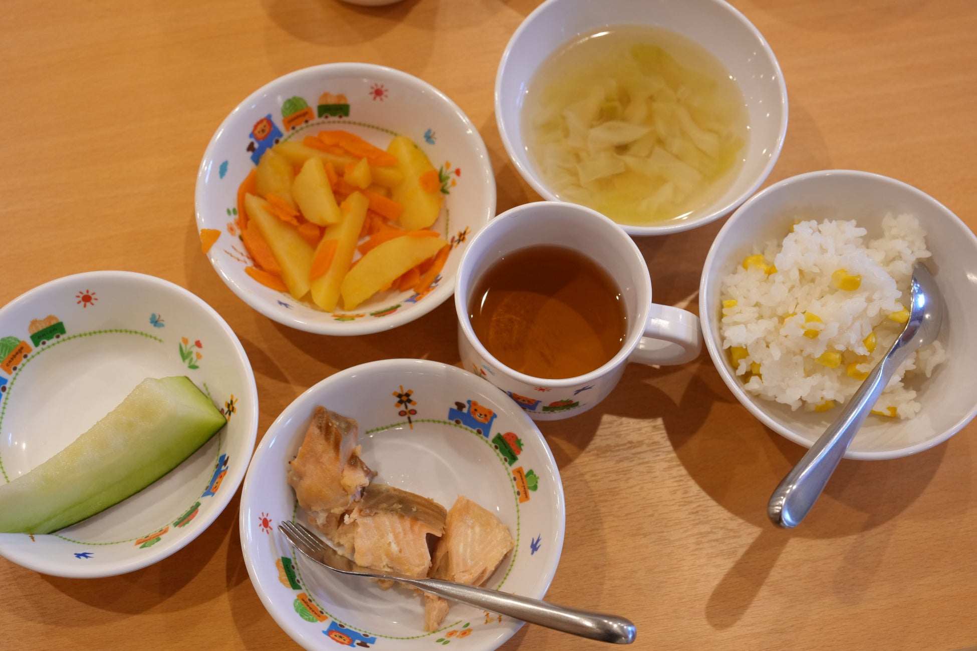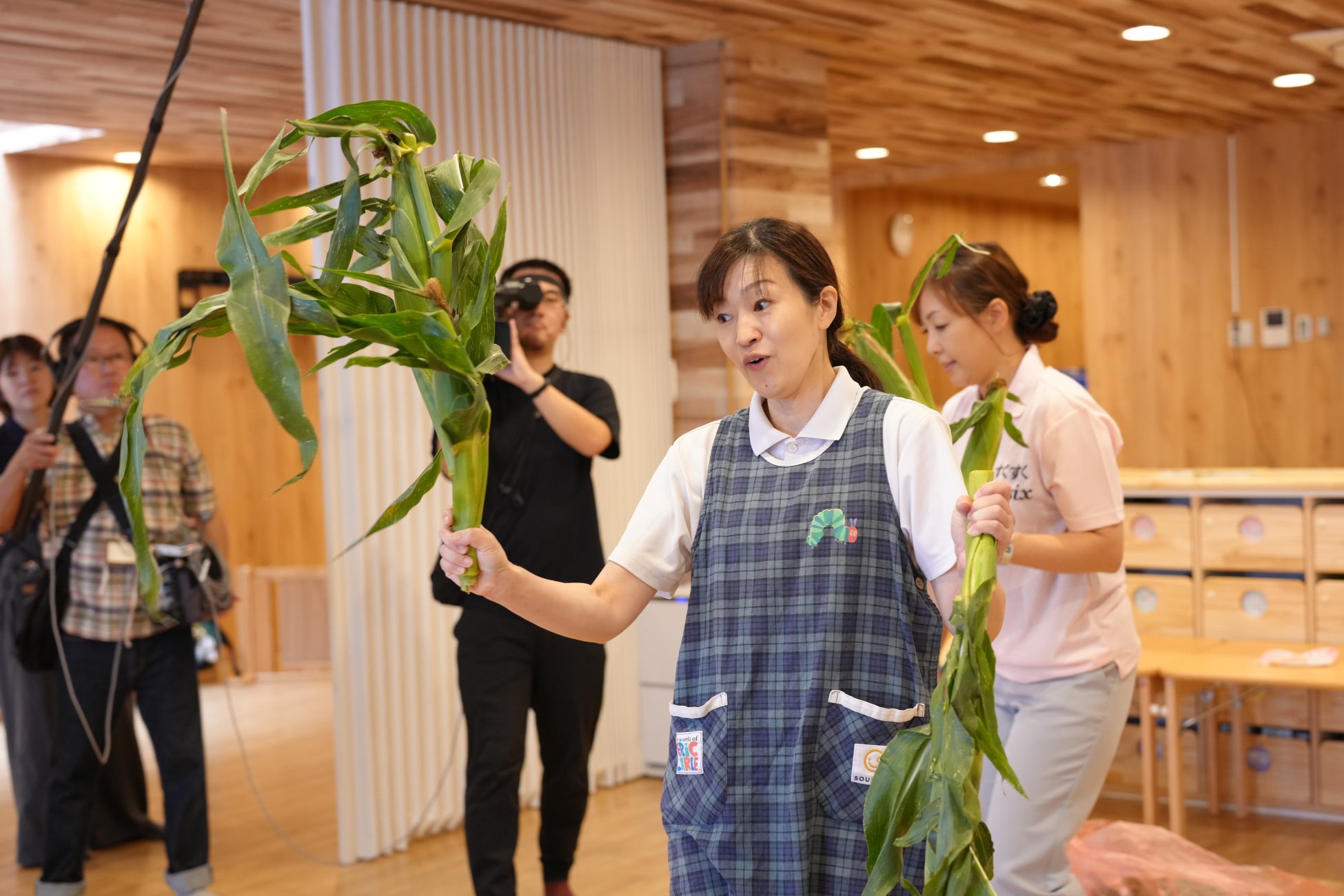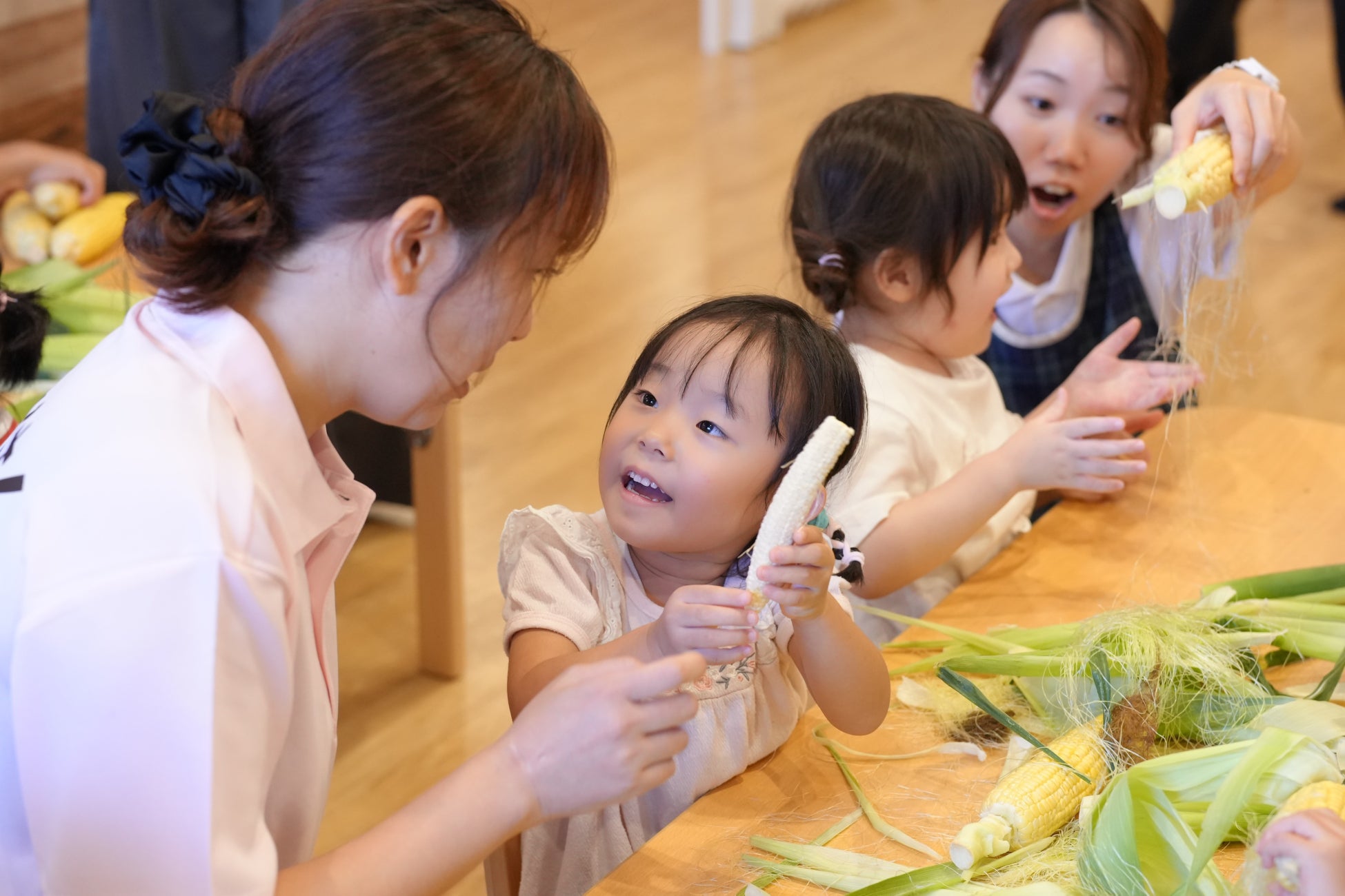 その後、畑から届いたとうもろこしの枝から実をもいで皮を剥き、個性豊かな実を収穫した園児たち。もぎたての実の香りを嗅いだり、愛おしそうに抱えたり、むしった粒を味わったりと五感で楽しむ姿が見られました。この日の給食メニューでは、とうもろこしごはんが登場。園児たちの食も進んでいました。