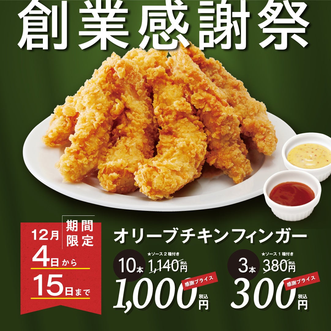 期間中は感謝プライスとして、オリーブチキンフィンガー3本が380円⇒300円(税込)に、オリーブチキンフィンガー10本が1,140円⇒1,000円(税込)となり、1本あたり100円のオトクな価格での提供をいたします。
