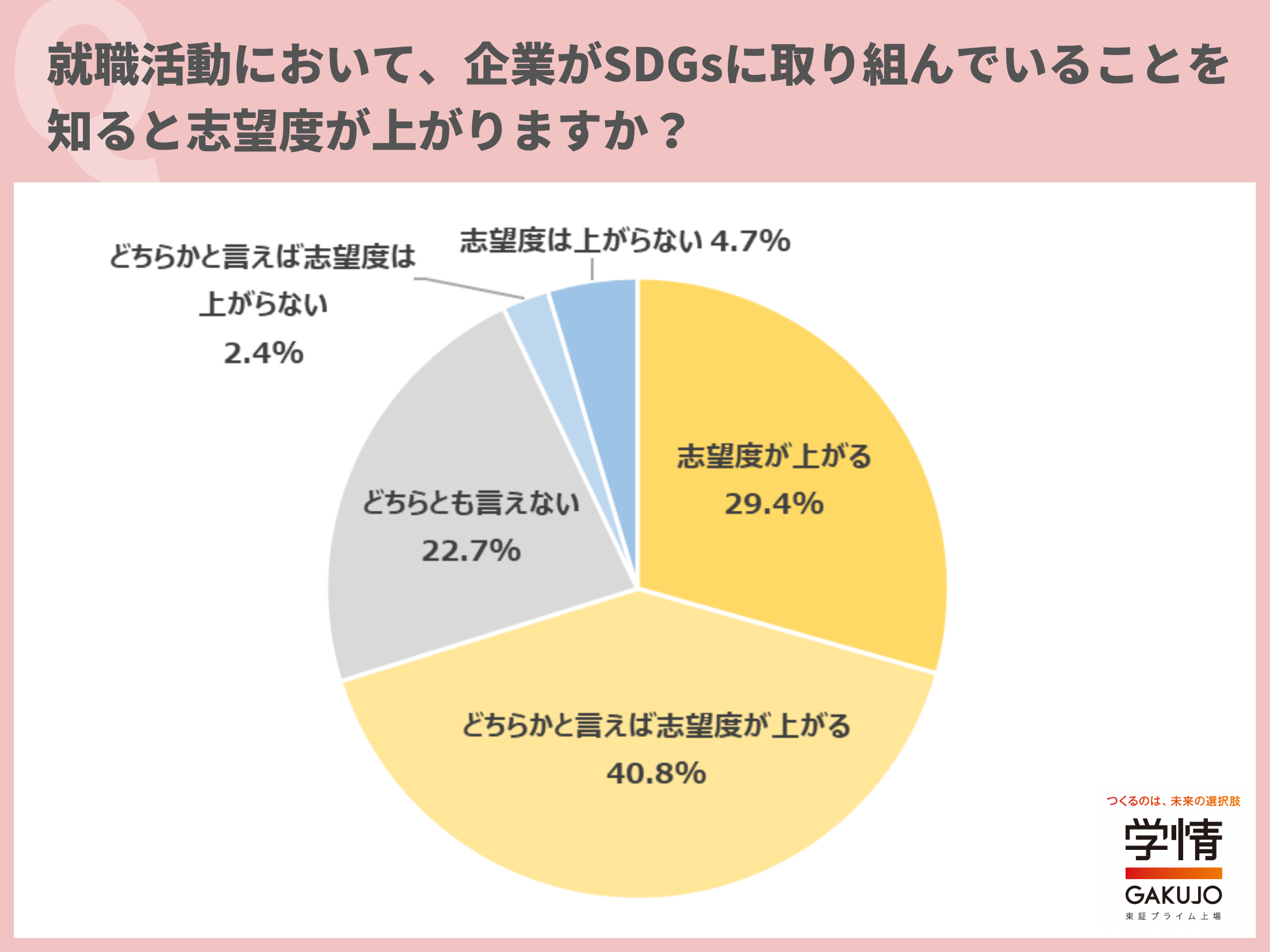就職活動において、企業がSDGsに取り組んでいることを知ると「志望度が上がる」と回答した学生が29.4%に上りました。「どちらかと言えば志望度が上がる」と回答した学生40.8%を合わせると、7割超の学生が「企業がSDGsに取り組んでいることを知ると、志望度が上がる」としています。「SDGsの達成に貢献する企業のほうが業績も伸ばしていると思う」「自社の利益だけでなく、社会に関心を持つ企業は好感が持てる」「SDGsの達成や、社会課題の解決に貢献しようとしている企業で働きたい」などの声が寄せられました。