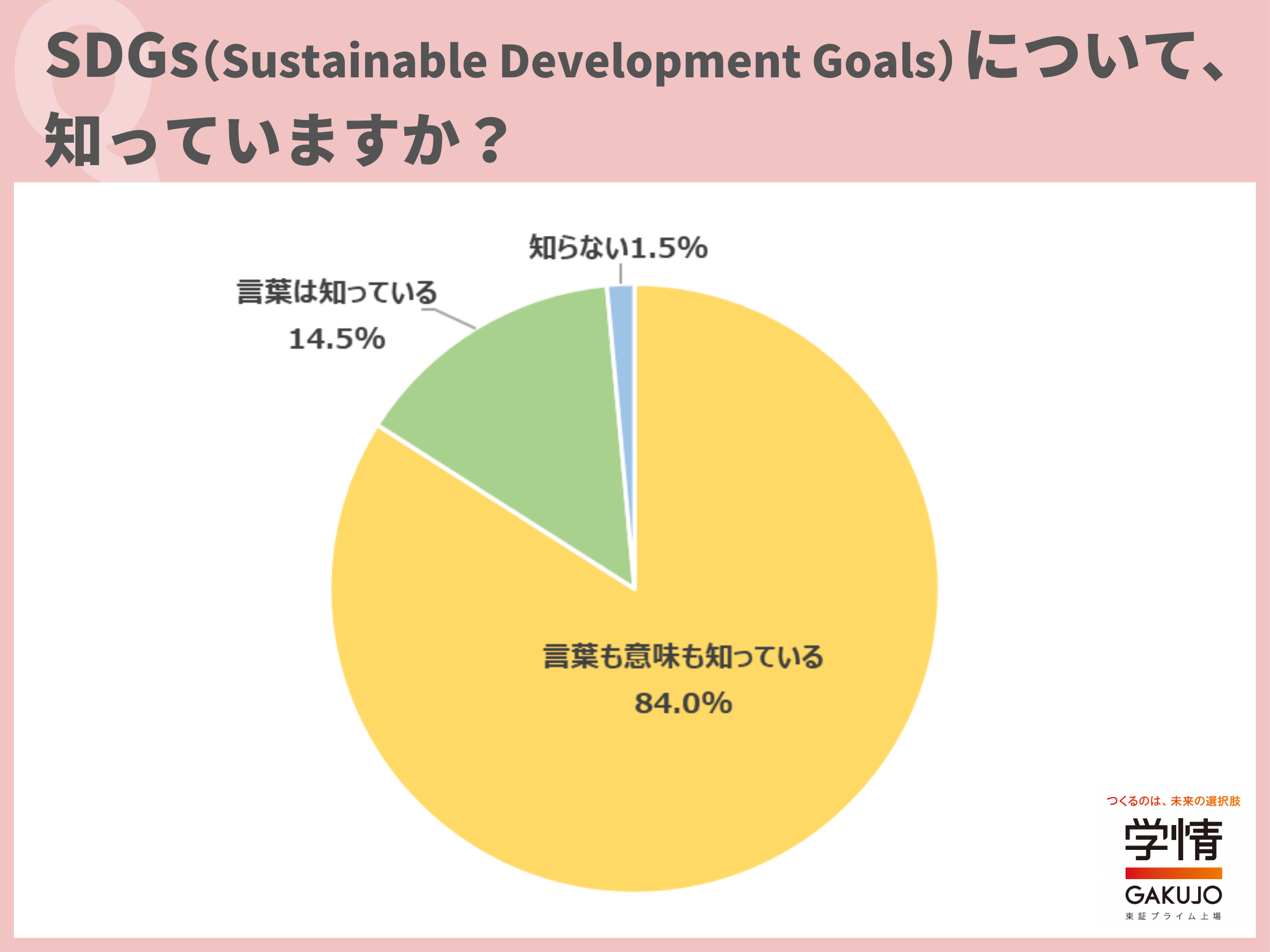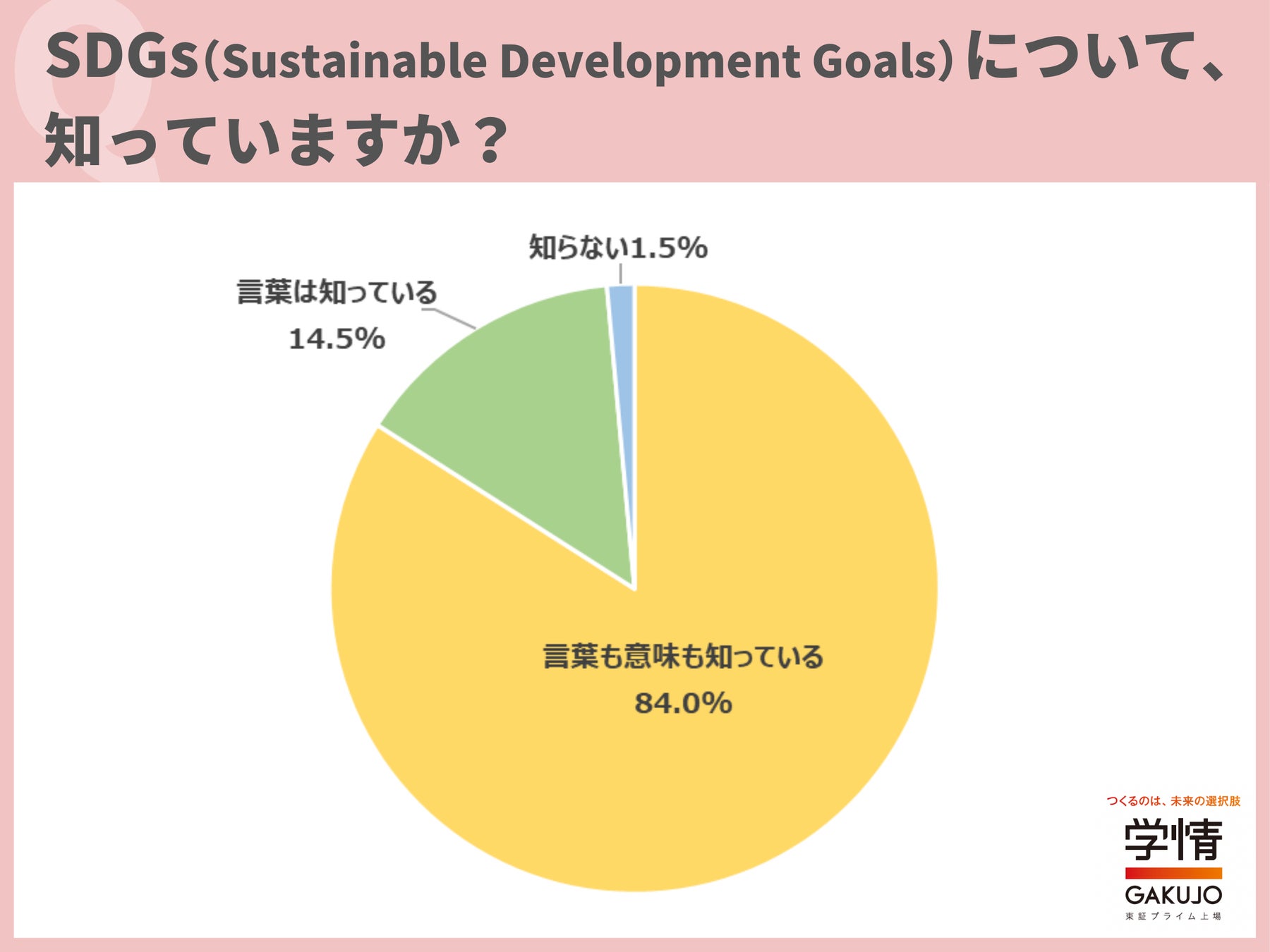 「SDGs(Sustainable Development Goals)」について、「言葉も意味も知っている」の回答が84.0%でした。「言葉は知っている」の回答14.5%も合わせると、「SDGs」の認知率は98.5%となりました。