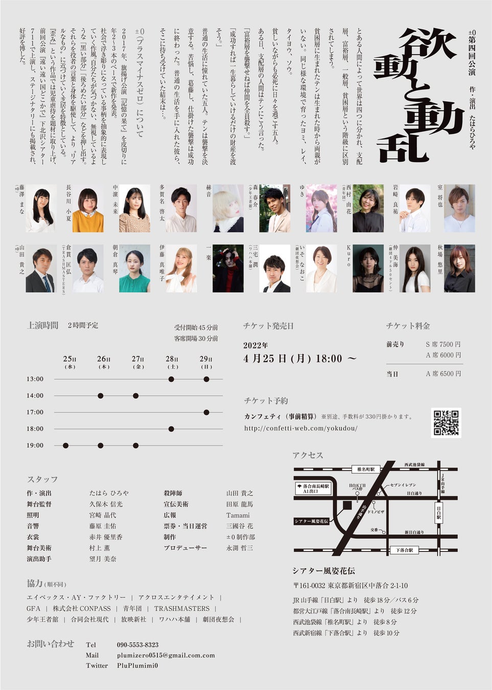 ±0(主宰:たはらひろや)主催、±0第四回本公演『欲動と動乱』が2022年5月25日 (水) ~2022年5月29日 (日)にシアター風姿花伝(東京都新宿区)にて上演されます。チケットはカンフェティ(運営:ロングランプランニング株式会社、東京都新宿区、代表取締役:榑松 大剛)にて4月25日(月)18:00より発売開始です。