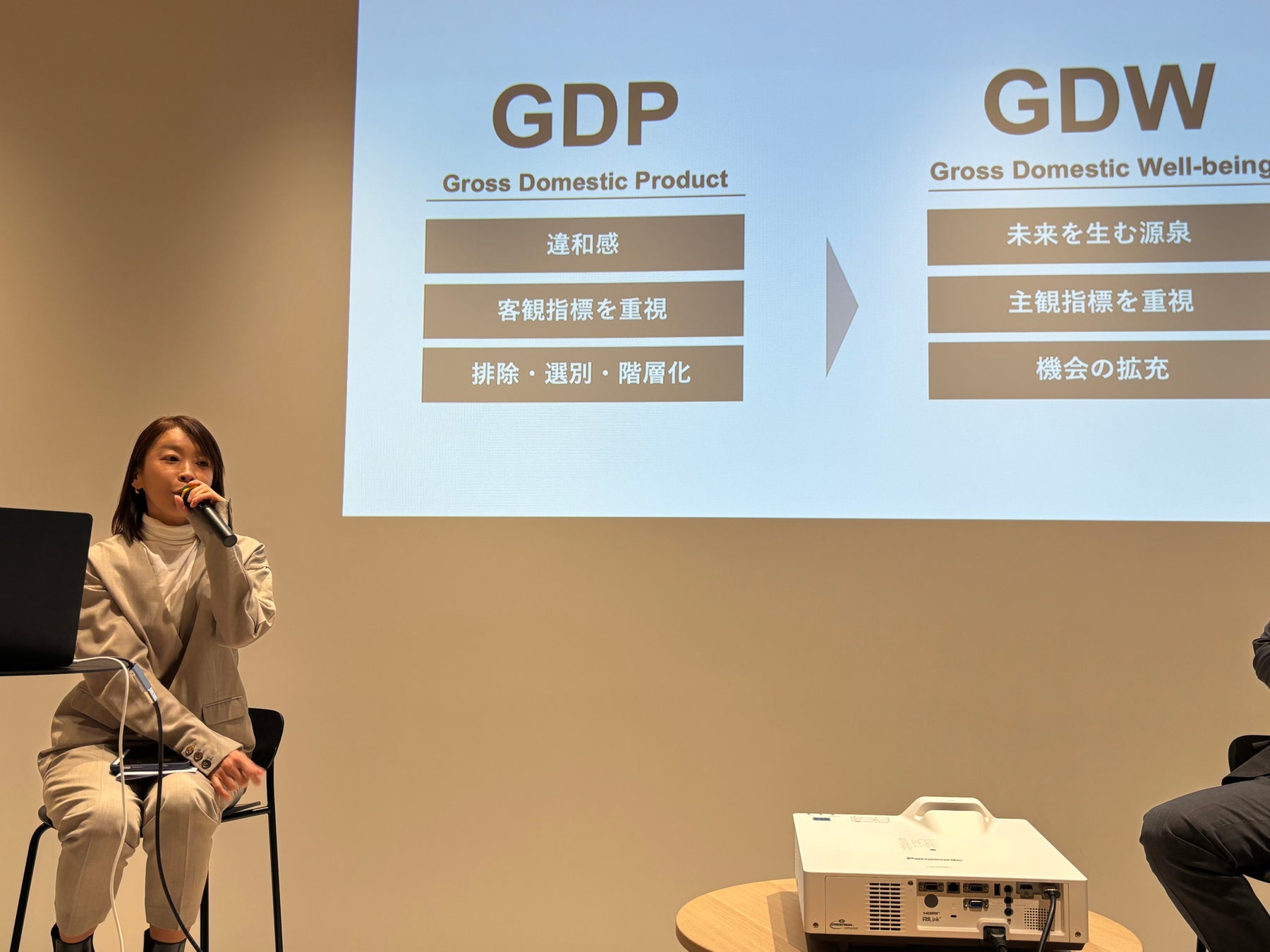 今まで、政府や法人が何を重視していたかというと完全にGDP(Gross Domestic Product)でした。GDPに縛られるがゆえに、違和感があったとしても、客観指標を重視したり、「今すぐにできる人」が選別されたり、といった状況だったのかなと思います。これからの日本は少子高齢化で、いろいろな方がそれぞれ持つ可能性を組み合わせて次の未来を生むしかないんです。そうなった時に、これからは客観指標から主観指標へ、すなわち、一人ひとりがどんな気持ちを感じているか、幸せを感じているかが大切になっていくのではないでしょうか。GDPではなく、Well-beingの総量、すなわちGDW(Gross Domestic Well-being)が経済においても重要な指標になっていくのではないかと思います。私たちのミッションは、このまま社内だけにとどまらずに、まっすぐ社会に対しても行っていきたいです。いつかはこの「女性活躍」というような目標やイベントがなくなって欲しいと心から思っています。