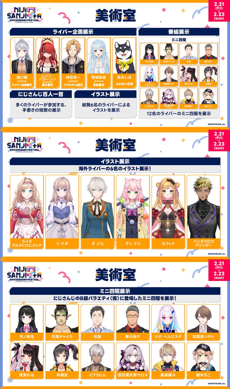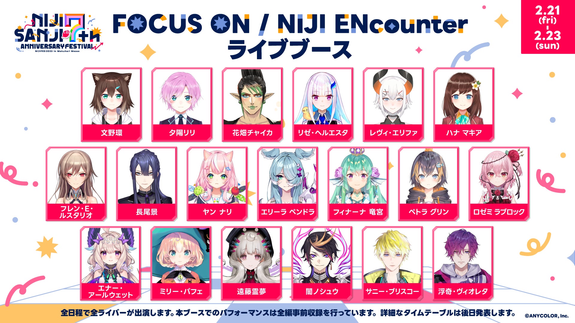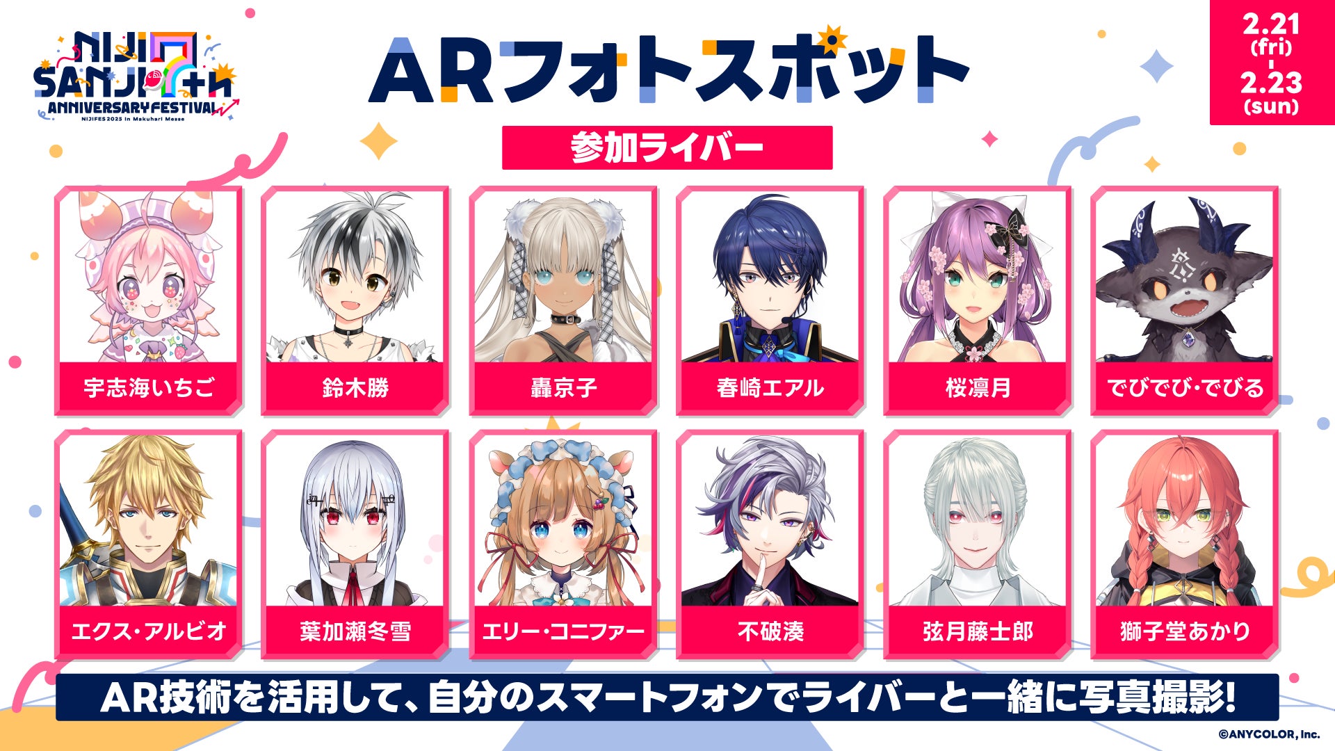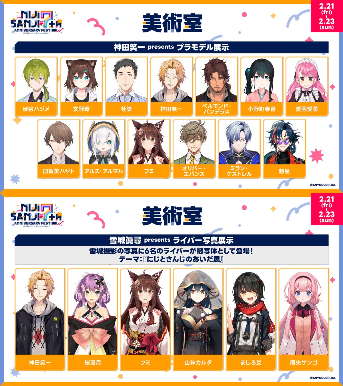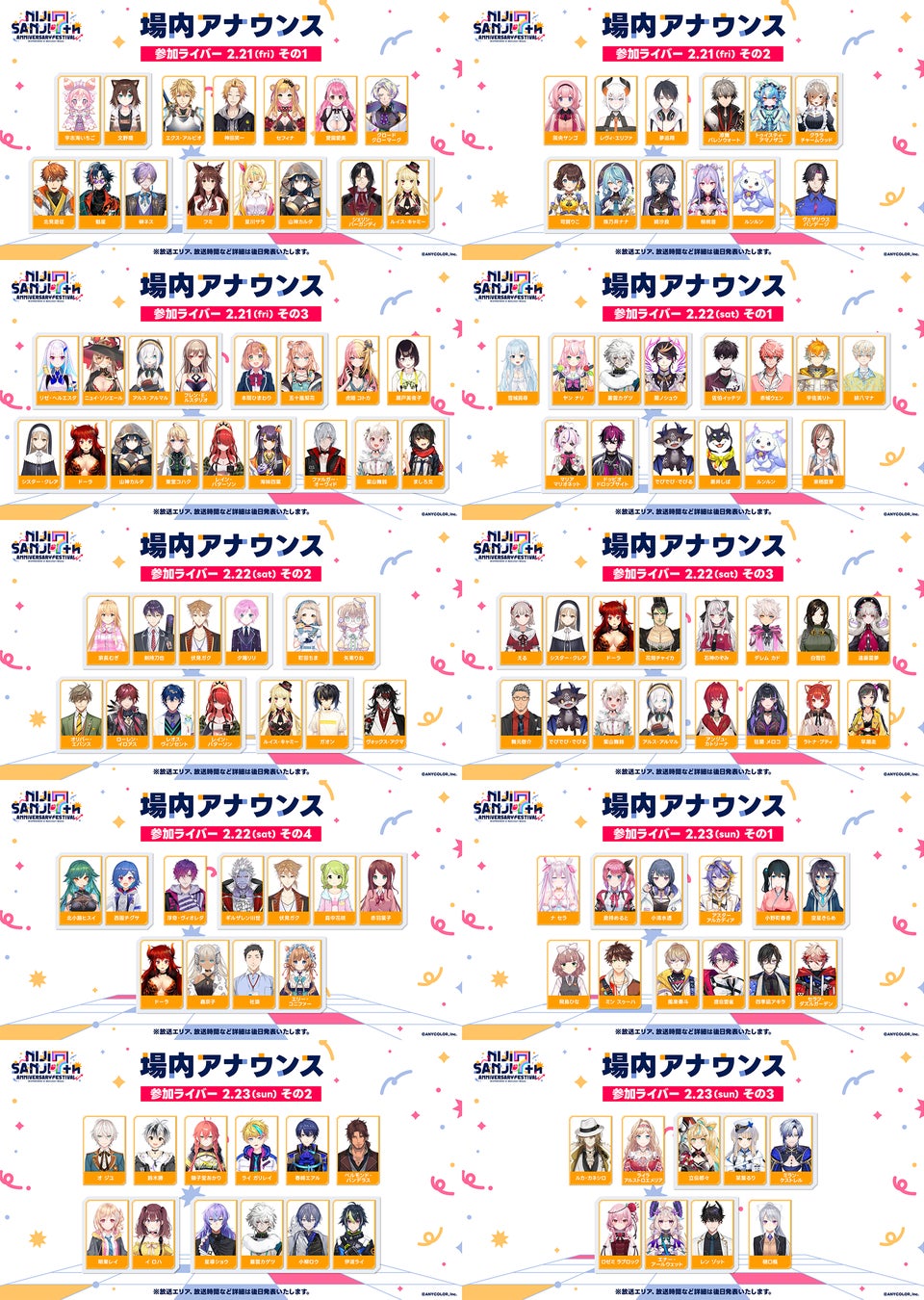 樋口楓 / 月ノ美兎 / える / 家長むぎ / 森中花咲 / 鈴木勝&フミ / シスター・クレア / 本間ひまわり / 鷹宮リオン / 小野町春香 / レヴィ・エリファ / 天宮こころ / ルイス・キャミー / 来栖夏芽 / 甲斐田晴 / 空星きらめ / オリバー・エバンス / 海妹四葉 / セラフ・ダズルガーデン / 五十嵐梨花 / ソフィア・ヴァレンタイン / 佐伯イッテツ / ミラン・ケストレル / 立伝都々 / 司賀りこ / 綺沙良
