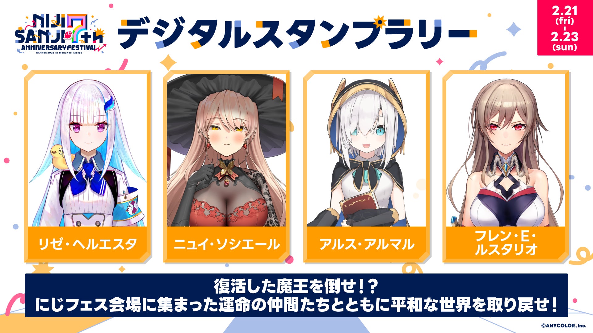 文野環 / 夕陽リリ / 花畑チャイカ / リゼ・ヘルエスタ / レヴィ・エリファ / ハナ マキア / フレン・E・ルスタリオ / 長尾景 / ヤン ナリ / エリーラ ペンドラ / フィナーナ 竜宮 / ペトラ グリン / ロゼミ ラブロック / エナー・アールウェット / ミリー・パフェ / 遠藤霊夢 / 闇ノシュウ / サニー・ブリスコー / 浮奇・ヴィオレタ