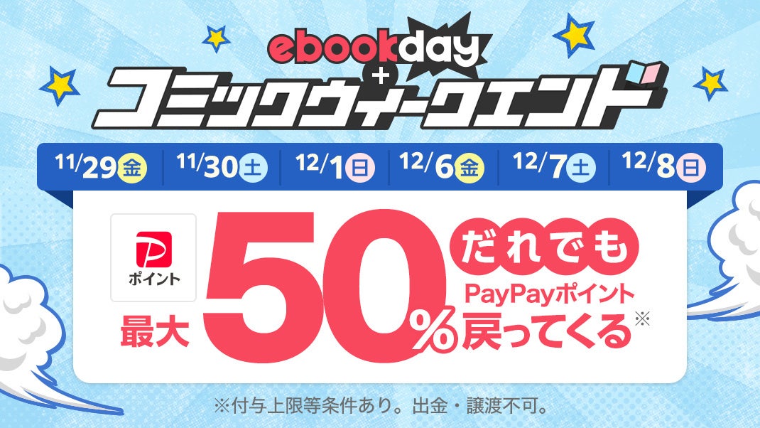 電子書籍販売サイト「ebookjapan」をLINEヤフー株式会社と協力して運営するLINE Digital Frontier株式会社 (本社:東京都品川区、代表取締役社長:髙橋将峰) は、電子書籍販売サイト「ebookjapan」では、11月29日(金)の「イーブックの日」になぞらえ、いいブックと電子書籍のebookをかけた「ebookday」を開催致します。