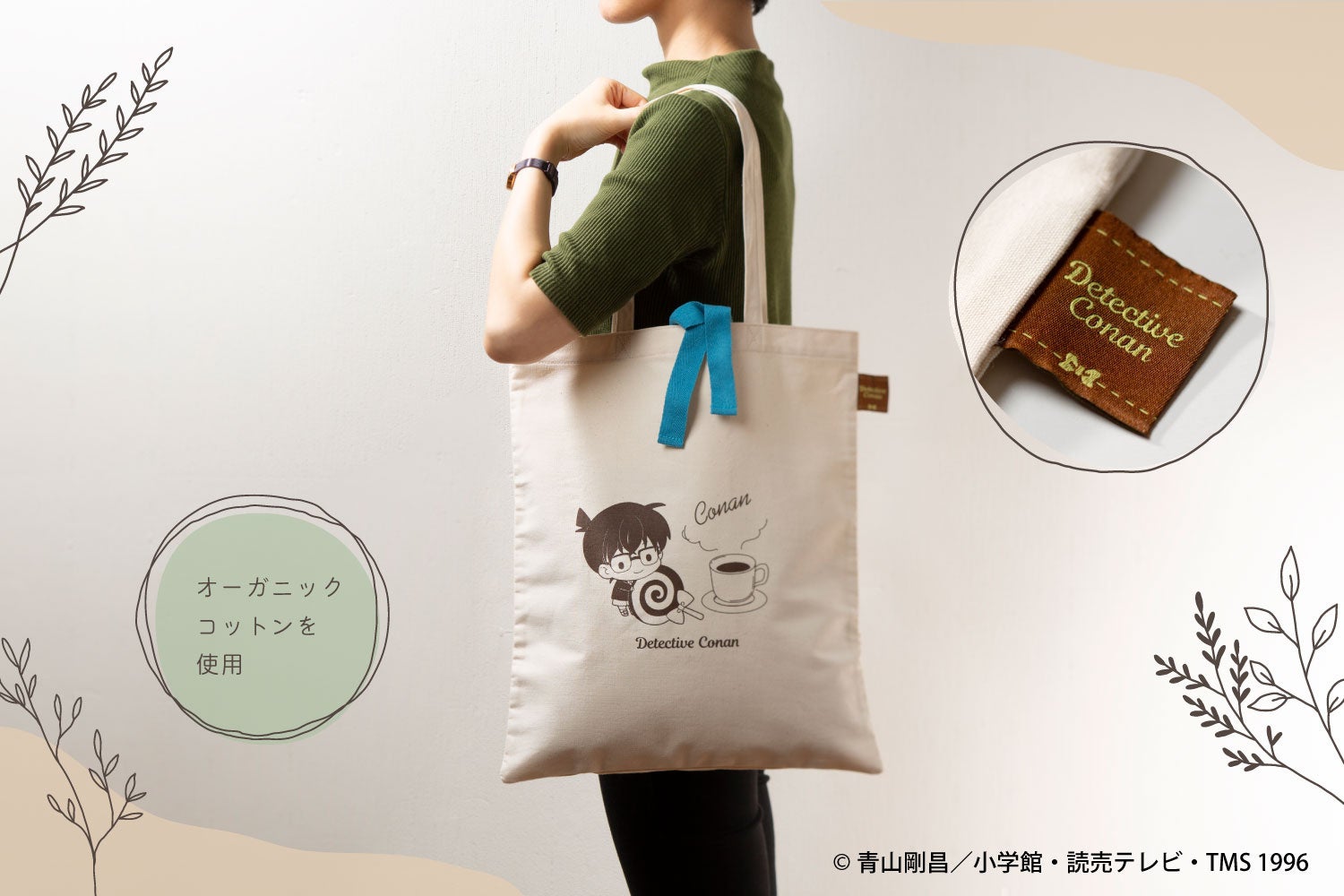 可愛らしいコナンたちがプリントされた、ほっこりするトートバッグ。それぞれ異なるカラーリボンもポイントです。生地はオーガニックコットンを使用し、パッケージは再生紙を使用しています。箱の窓からキャラクターがのぞく仕様になっています。