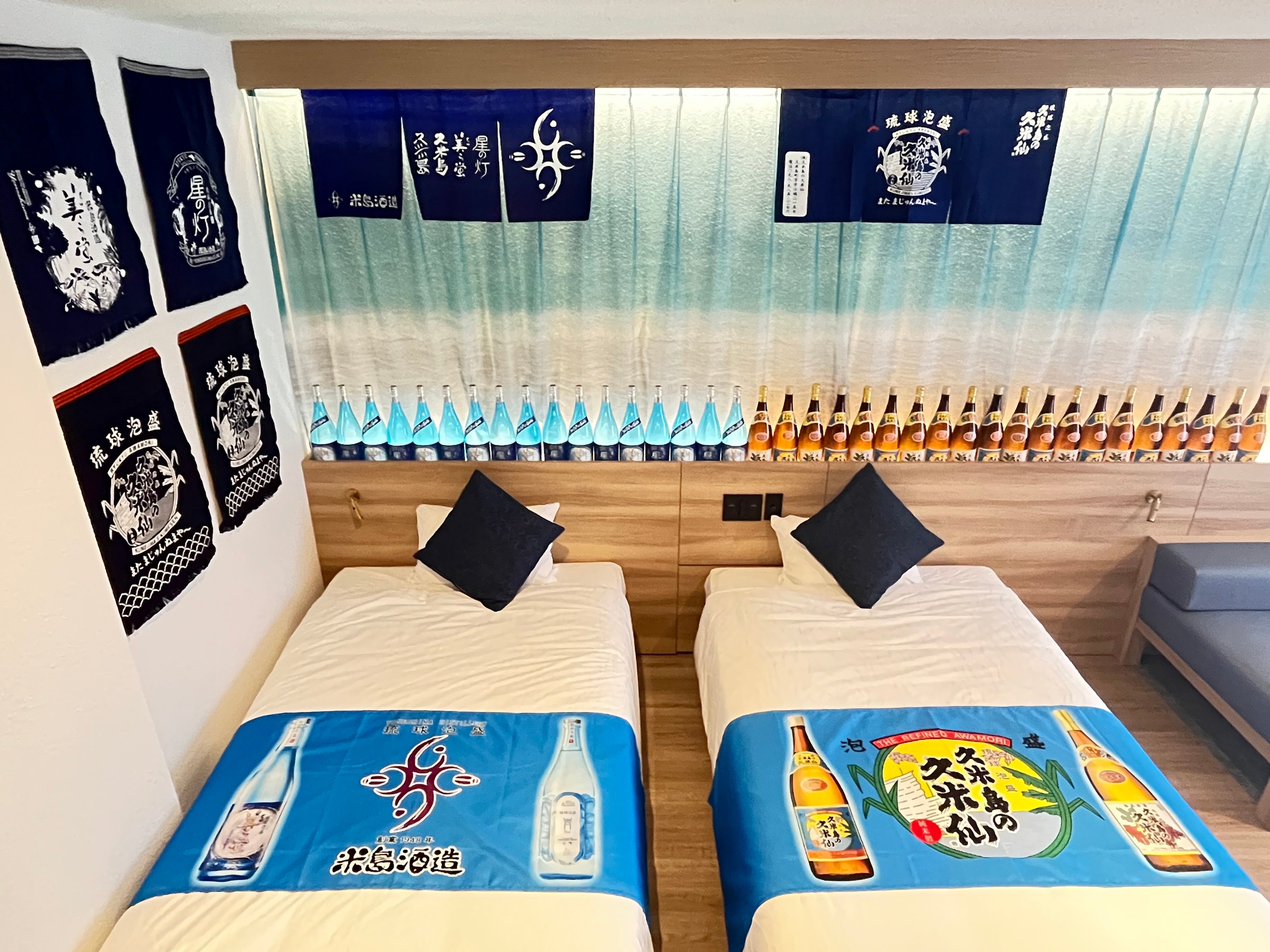 リゾートホテル久米アイランドは、ホテル客室にて久米島の名産の泡盛をお客様に体験いただき、また、泡盛を通じて地域産業への貢献をしたいと考え、久米島に2軒しかない泡盛酒造所である、株式会社久米島の久米仙、米島酒造株式会社とコラボレーションし、「久米島泡盛ルーム」を2月16日(金)より発売します。「久米島泡盛ルーム」は、ベッドパネルに泡盛の一升瓶を並べ、壁にのれんや前掛け、のぼり、写真を飾り、ベッドカバーを装飾しました。また、夕食時に3種類の泡盛とおつまみの飲み比べセットをご提供し、株式会社久米島の久米仙の売店にて泡盛の試飲とお買い物、米島酒造株式会社の工場見学と、売店にて試飲とお買い物をお楽しみいただけます。価格は夕食・朝食2食付き17,000円~(1室/税サ込)。