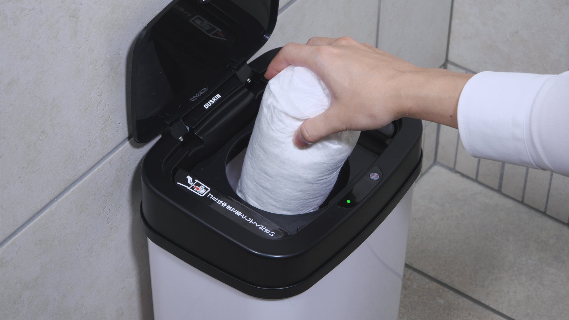 『オートダストボックス』は、中が見えにくい二重フタ構造と非接触で開閉する自動センサー式のフタを採用し、衛生的で快適にご使用いただける商品です。ニオイ漏れを軽減し、直接触れることなくご使用いただけます。また、サニタリー用品だけでなく、大人用のオムツも入るサイズの投入口を備えており、どなたでも安心してご利用いただけます。