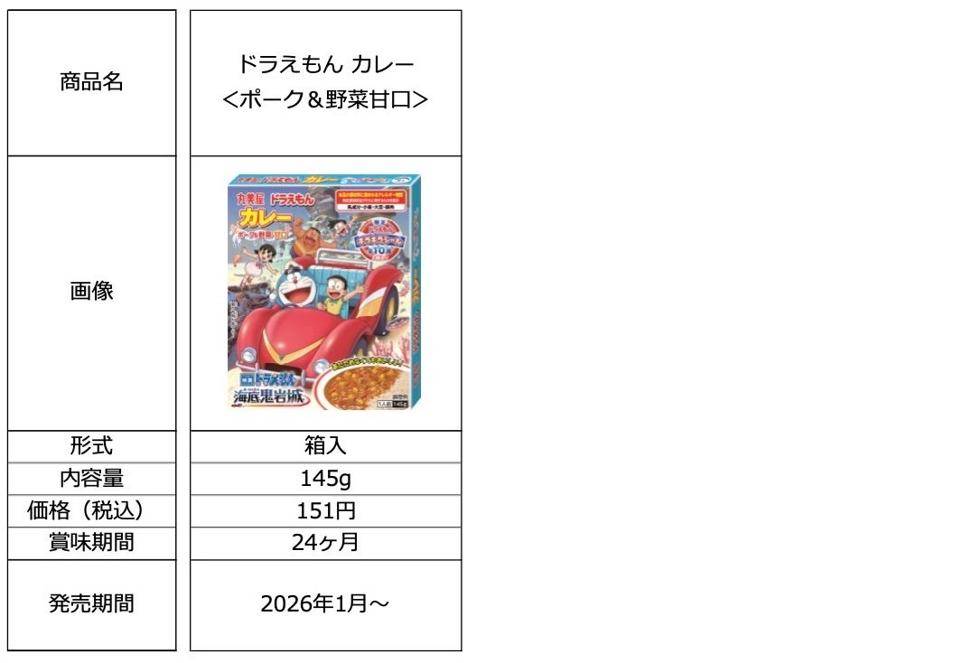 丸美屋食品工業株式会社(本社:東京都杉並区、社長:阿部豊太郎)は、大人気の国民的キャラクター「ドラえもん」を起用した「ドラえもん カレー<ポーク&野菜甘口>」を、「映画ドラえもん 新・のび太の海底鬼岩城※」限定パッケージにて、2026年1月からリニューアル発売いたします。 ※2026年2月27(金)に公開予定。