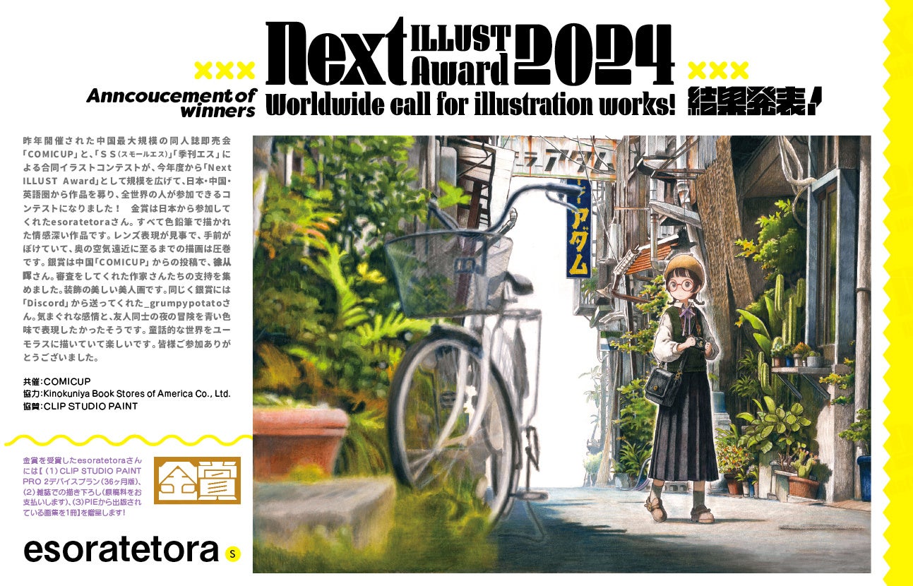 2023年に開催された中国最大規模の同人誌即売会「COMICUP」と、日本のイラスト投稿雑誌「SS(スモールエス)」「季刊エス」による合同イラストコンテストが、今年度からアメリカ紀伊國屋書店の協力を得て「Next ILLUST Award」として規模を広げ、⽇本・中国・英語圏から作品を募り、全世界の人が参加できるコンテストとしてスタート。