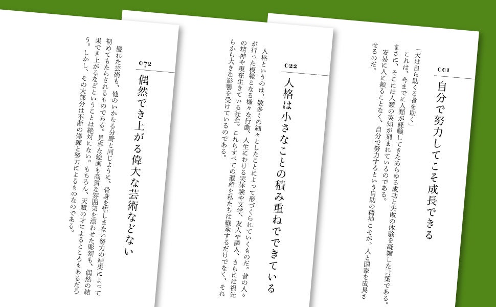フランス語、ドイツ語、イタリア語、スペイン語、アラビア語、トルコ語など、数多くの外国語に翻訳されて世界各国で出版された、世界的名著『自助論』を、1ページに1つのエッセンスとしてまとめ、読みやすい構成でお届けします。