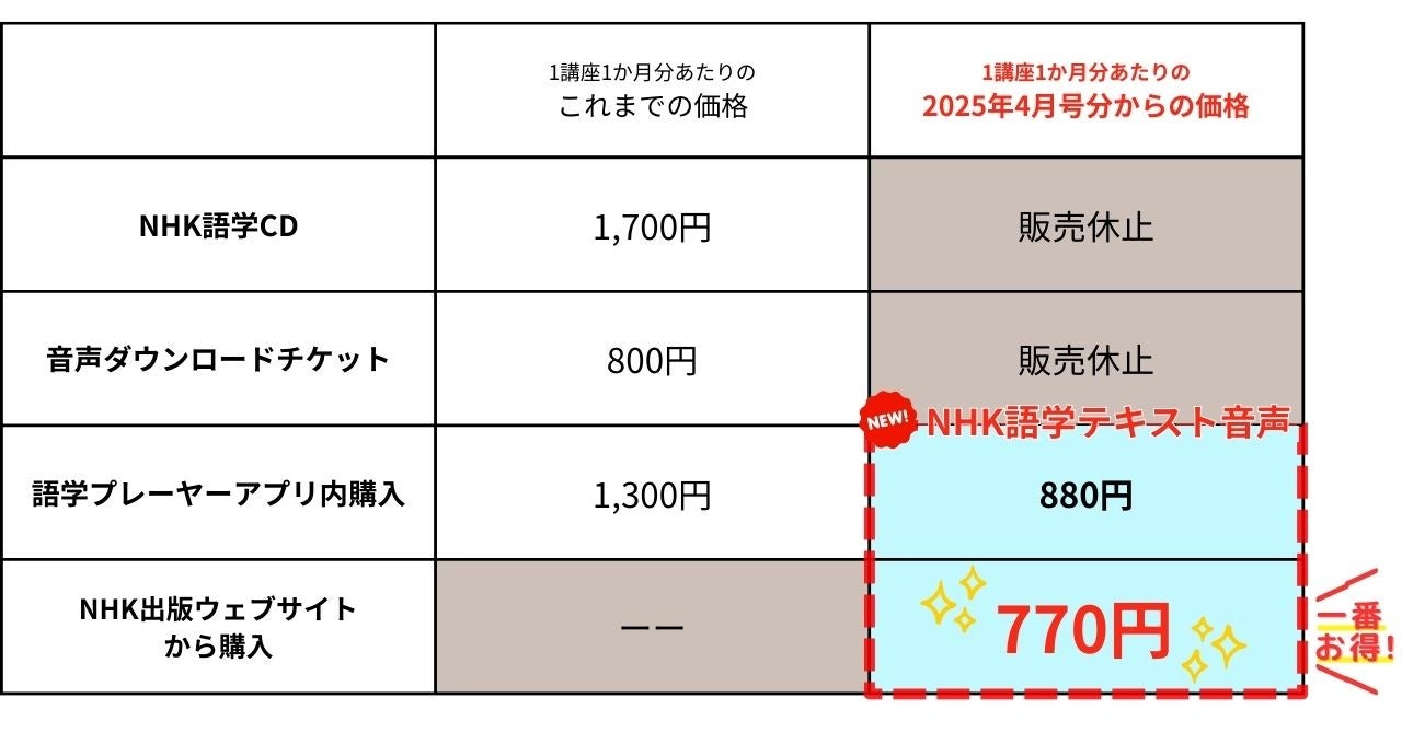 これまでは1講座1か月分の音声の価格は『NHK語学CD』では1,700円(税込)、『音声ダウンロードチケット』では800円(税込)でしたが、『NHK語学テキスト音声』はNHK出版ウェブサイトでの販売価格が770円(税込)とこれまでよりお買い得になります。