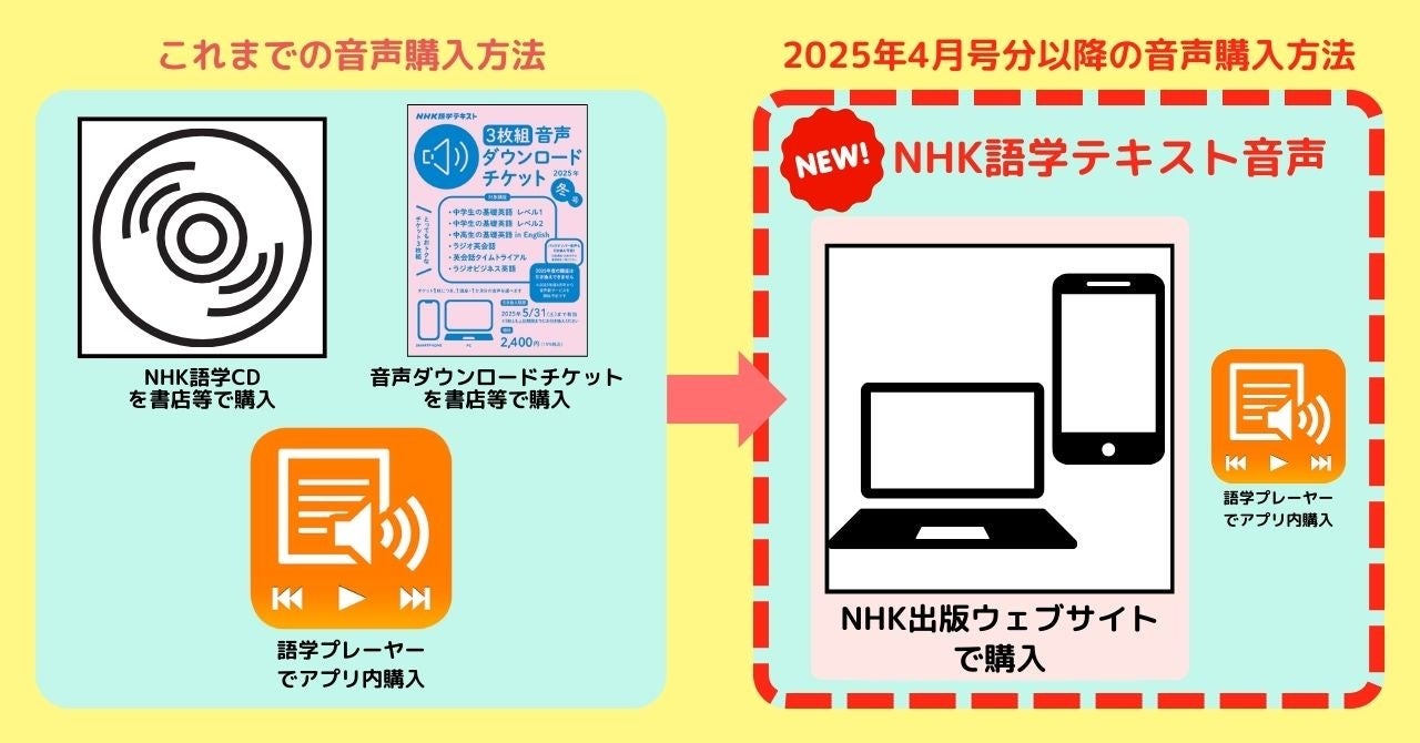 音声教材のご購入方法は『NHK語学テキスト音声』の配信開始以降、下図のように変わります。