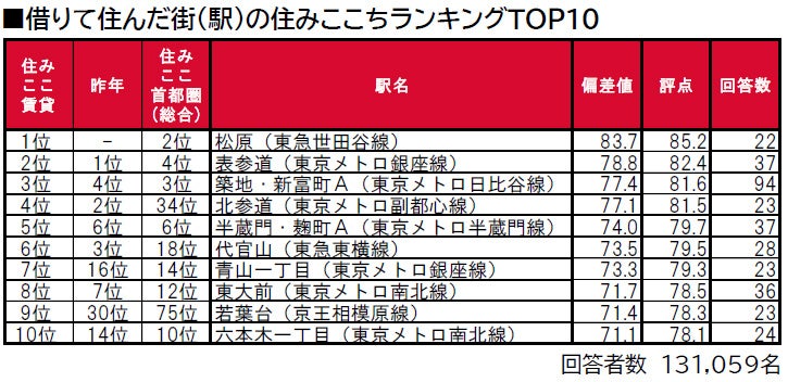 1位は東京都世田谷区に位置する松原で、唯一偏差値80台の極めて高い評価を得ており、「住みここち2023<首都圏版>」では2位です。松原は、昨年は累計回答数が20名未満でランキング集計対象外でした。2位は東京都港区に位置する表参道で、「住みここち2023<首都圏版>」では4位です。3位は東京都中央区に位置する築地・新富町A(近接駅の築地・東銀座・築地市場・新富町を統合)で、「住みここち2023<首都圏版>」では3位です。
