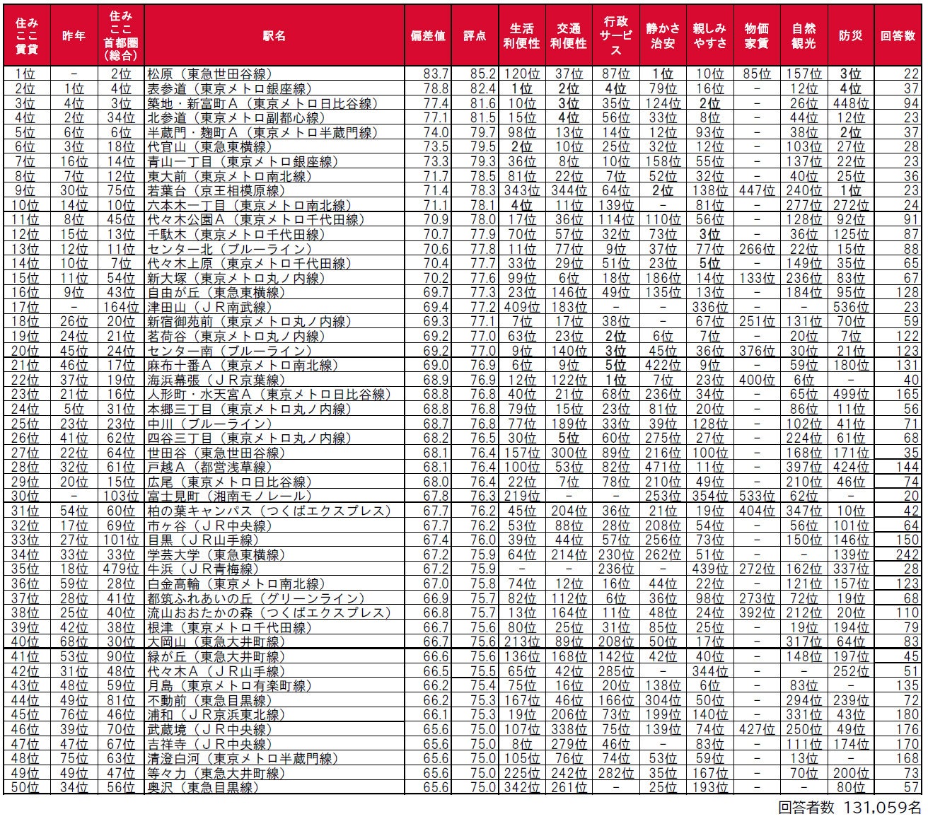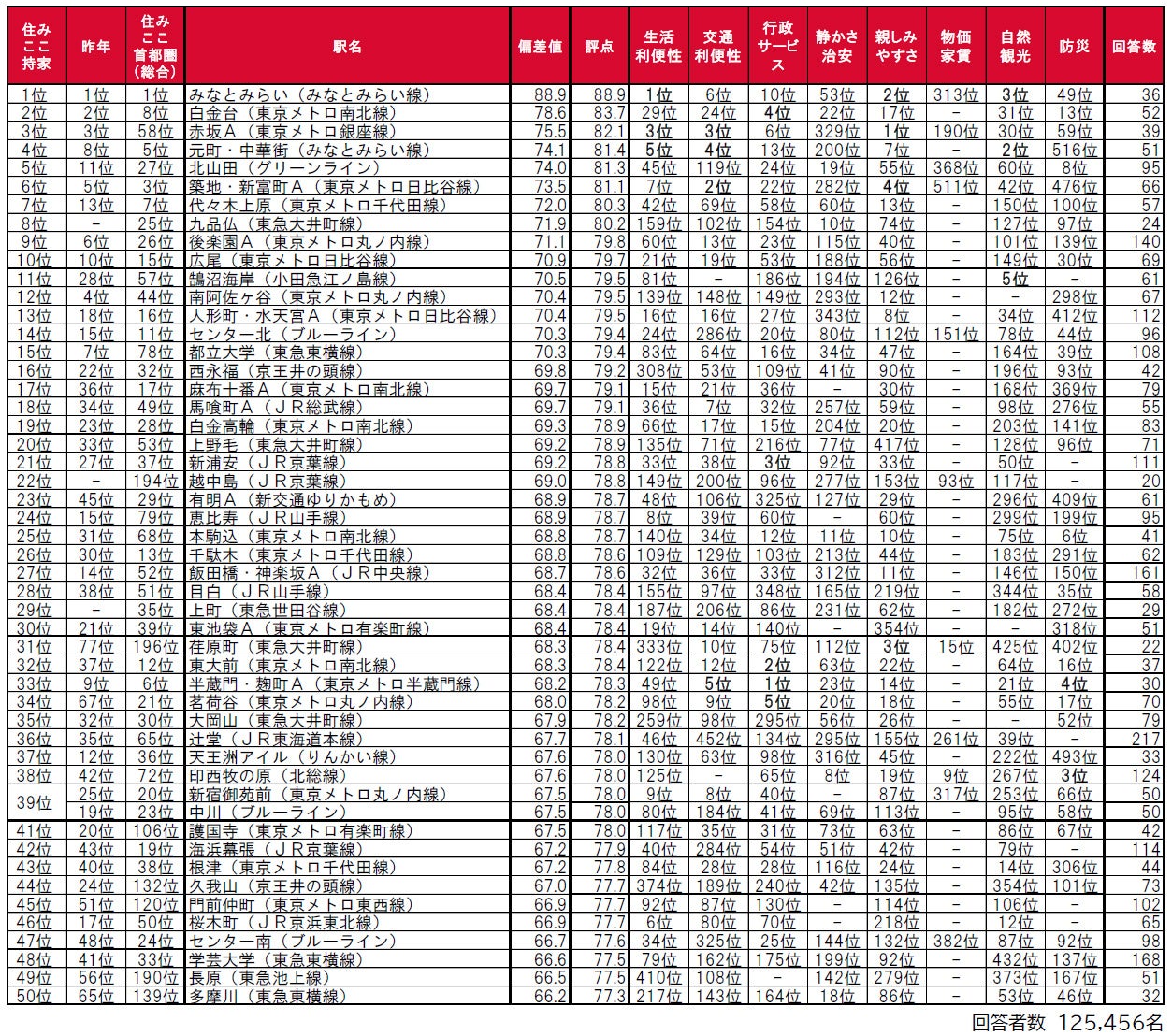 ●2位の表参道は、東京都港区に位置し、銀座線・千代田線・半蔵門線の3路線が乗り入れている駅で、因子別では「生活利便性」1位、「交通利便性」2位、「行政サービス」「防災」の2因子で4位の評価を得ています。