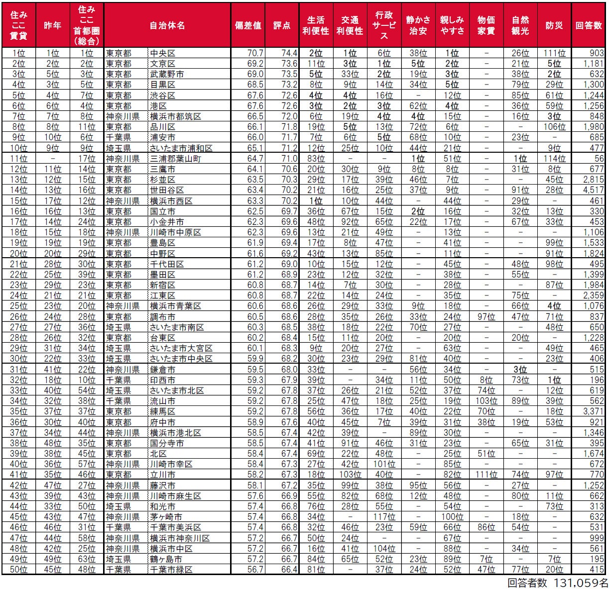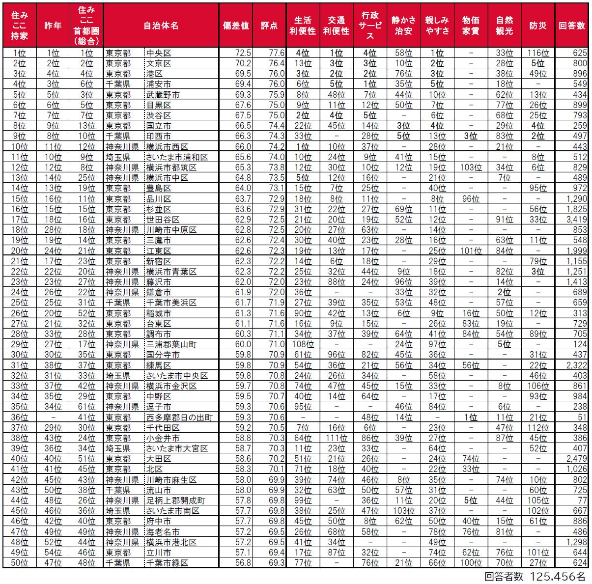 借りて住んだ街(自治体)の住みここちランキング〈1位~50位〉