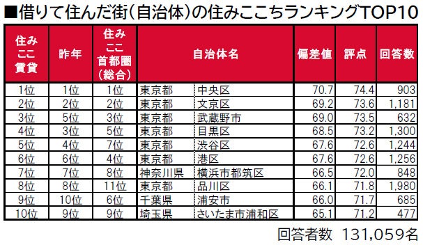 ■「借りて住んだ街(自治体)の住みここち」トップは、2年連続で東京都中央区