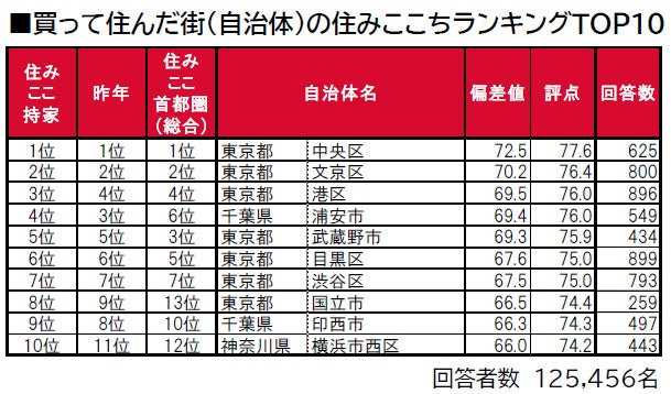 ■「買って住んだ街(自治体)の住みここち」トップは、3年連続で東京都中央区