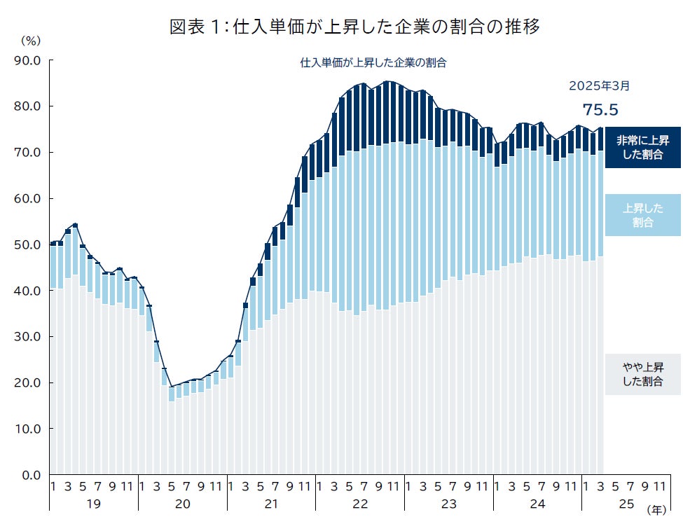 原材料やエネルギーなど、企業の仕入れ価格の上昇が続いている。TDB景気動向調査で把握している仕入単価の動向をみると、2025年3月時点で企業の75.5%が前年同月から仕入単価が『上昇』[1]していると捉えていた。前月(74.3%)から1.2ポイント増加し、2021年12月(71.8%)から40カ月(3年4カ月)連続で7割を超えている(図表1)。