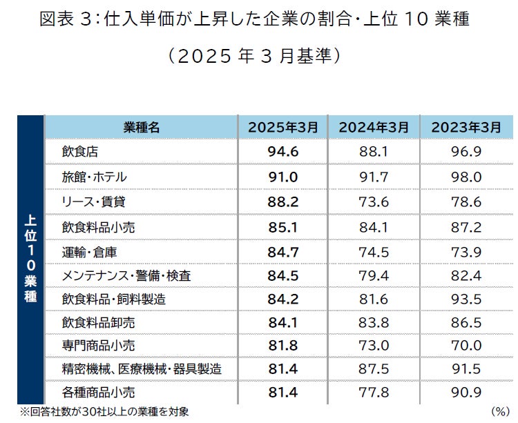 3年4カ月連続で7割超の企業が仕入単価の上昇に直面 「飲食店」「旅館・ホテル」では、9割超の企業で仕入単価が上昇し、事業環境に厳しさ
