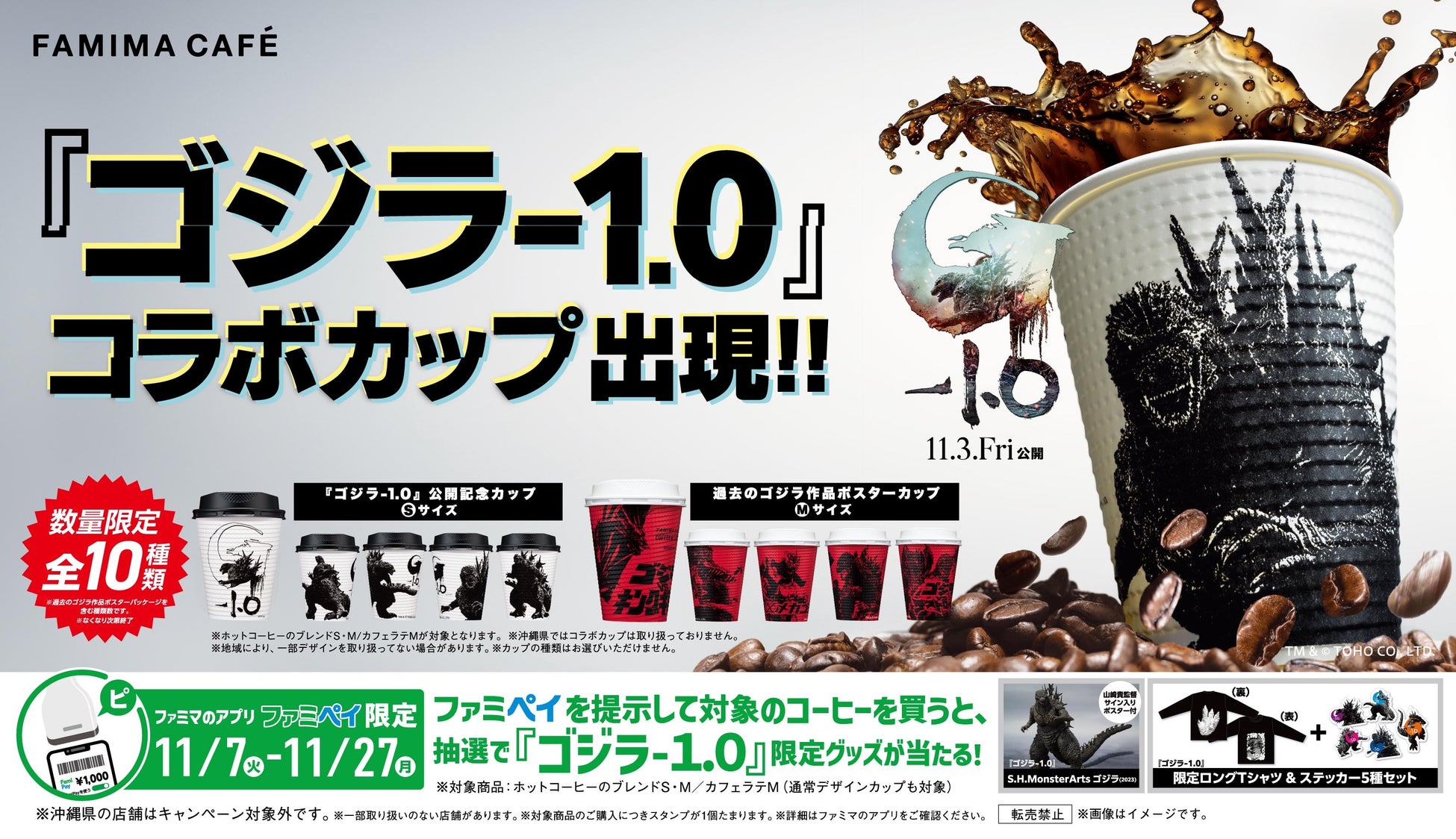 ゴジラ VS FAMIMA CAFÉ『ゴジラ-1.0』とコラボレーションキャンペーン開催!コーヒー・カフェラテのコラボカップ全10種類が数量限定で登場!
