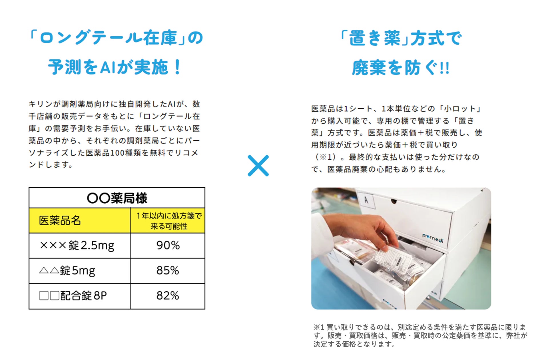 premediは、キリンのAI予測を活用することで薬局ごとの医薬品の利用確立を予測・配置し、少量ロットで管理が可能な置き薬サービスです。DXによる変革が進む薬局業界において本サービスを本格展開し、予測される取り扱い頻度の低い医薬品の適切な在庫管理と廃棄の最小限化を高田製薬とともにご提案し、薬局の課題解決を目指します。