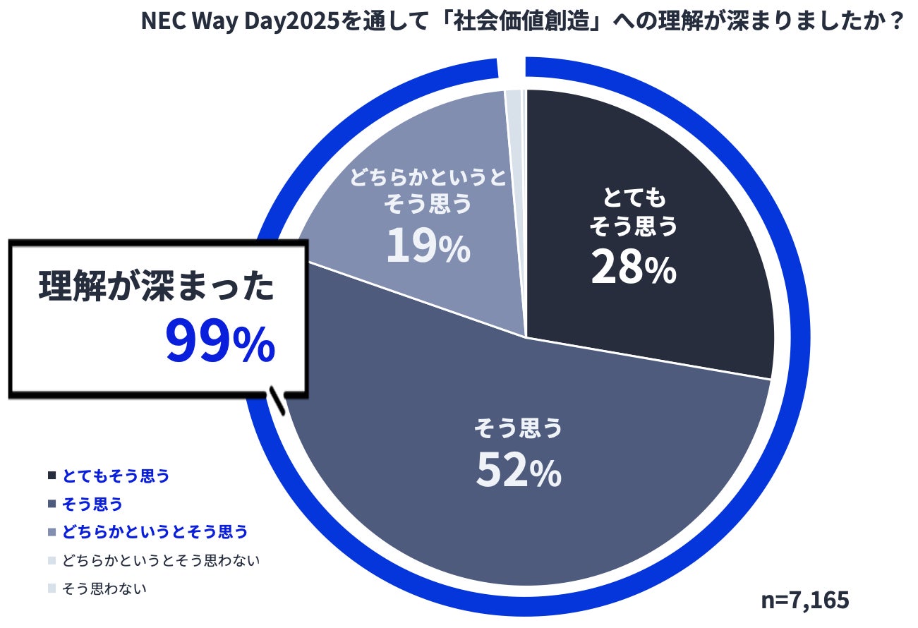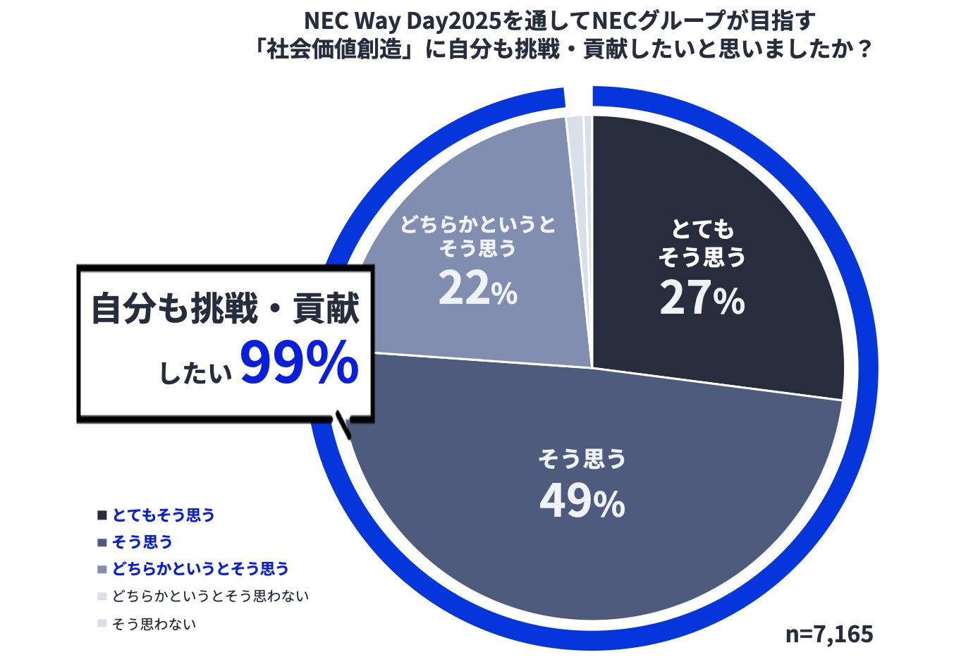 またNECグループでは創立記念日にあわせ、共通の価値観や行動の原点について社員一人ひとりが理解を深め、考え、未来への一歩を踏み出す社内イベント「NEC Way Day」を毎年開催しています。2025年に実施した同イベントのアンケート*4では、99%がイベントを通して「『社会価値創造』への理解が深まった」と回答。また、「NECグループが目指す『社会価値創造』に自分も挑戦・貢献したい」と回答した社員は98%にのぼり、Purposeが着実に社内に浸透していることを示しています。
