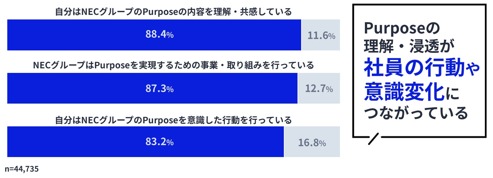 NECは「社会価値創造型企業」として成長していく中で、Purposeの社内浸透や、それに伴う社員の行動変容が企業価値の向上にどのようにつながっているかを可視化するための社内調査*3を実施しています。2023年にNECグループ社員約5万人を対象に実施した調査の結果では、88%が「自分は、NECグループのPurposeの内容を理解・共感している。」と回答。また、83%が「自分は、NECグループのPurposeを意識した行動を行っている。」と回答しており、Purposeの理解・浸透が社員の行動や意識変化につながっていることが明らかになりました。