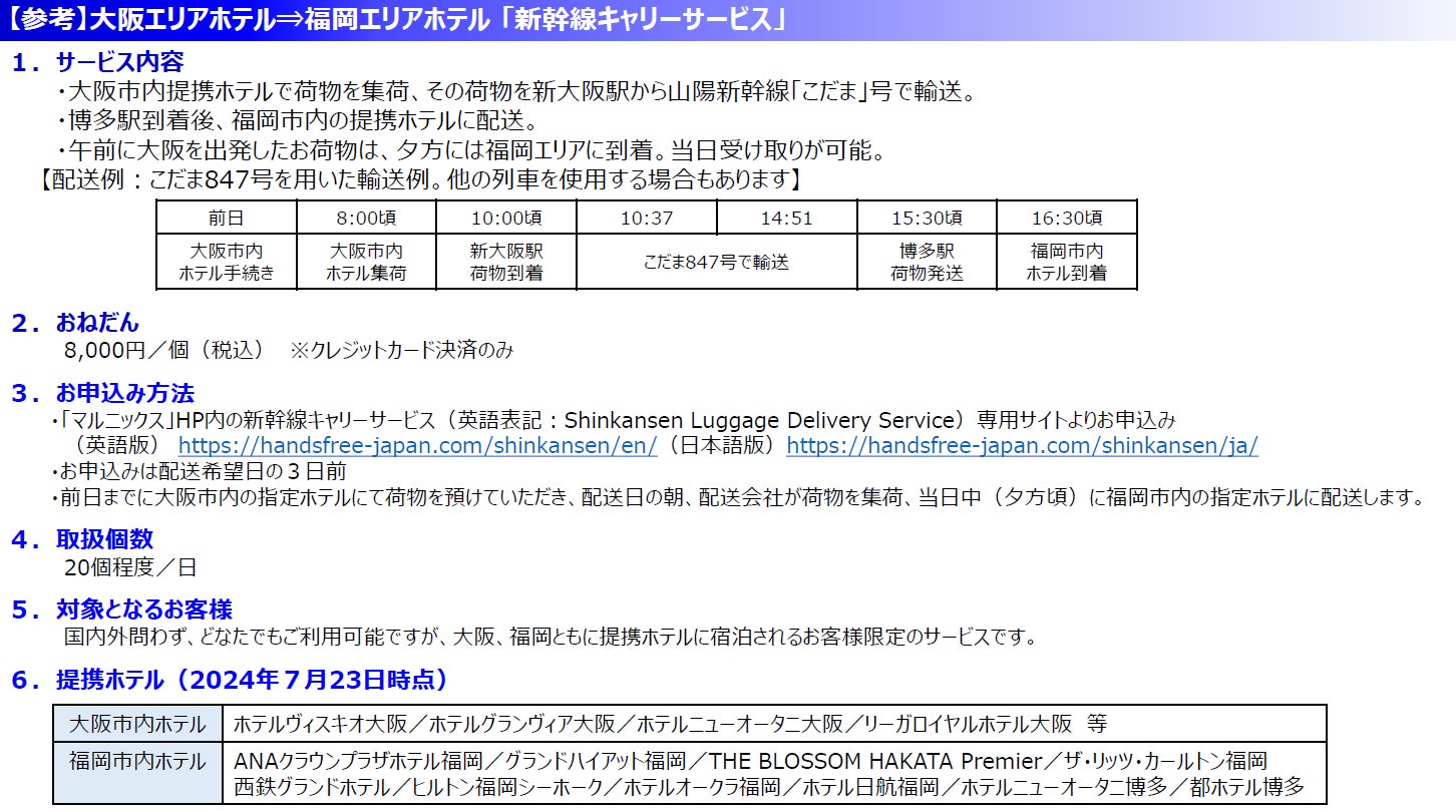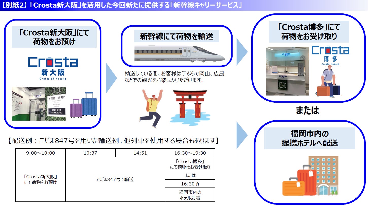 訪日外国人向け大型荷物輸送事業化に向けた推進協議会(以下、協議会。略称:訪日外国人荷物輸送事業化等推進協議会)では、2023年10月より、西日本旅客鉄道株式会社(以下、「JR西日本」)が運行する山陽新幹線を用いた荷物輸送サービスの実証実験「新幹線キャリーサービス(英語表記:Shinkansen Luggage Delivery Service)」を、株式会社ジェイアール西日本マルニックス(以下、「マルニックス」)とともに実施しています。この度、新たにマルニックスが展開する「Crosta新大阪」から「Crosta博多」へのキャリーサービス、および「Crosta新大阪」から福岡市内の指定ホテルへの「キャリーサービス」を開始し、「新幹線キャリーサービス」のメニューを拡充します。