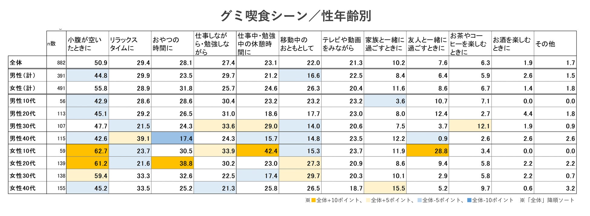 ※スクリーニング調査では、性別・年代別の構成が日本の人口構成比に近くなるようコントロールしながら、グミ・チョコレート菓子・スナック菓子(ポテトチップスを含む)を普段自分で購入し食べることがあると回答した人 (重複あり)のサンプルを回収しております。