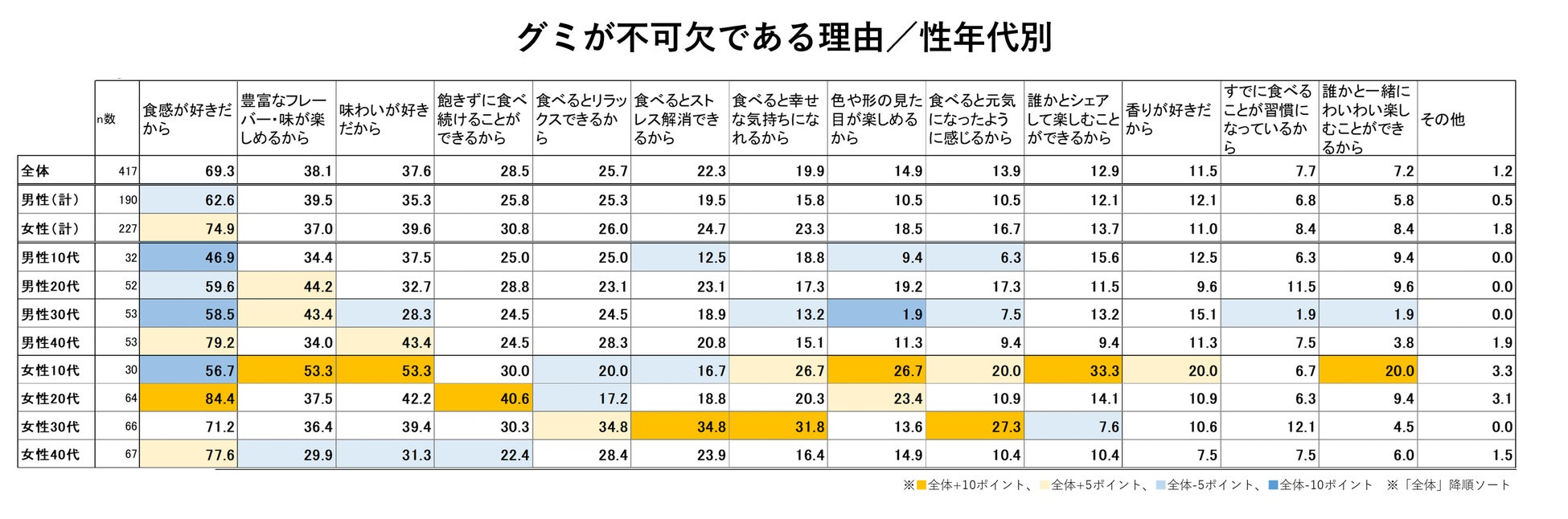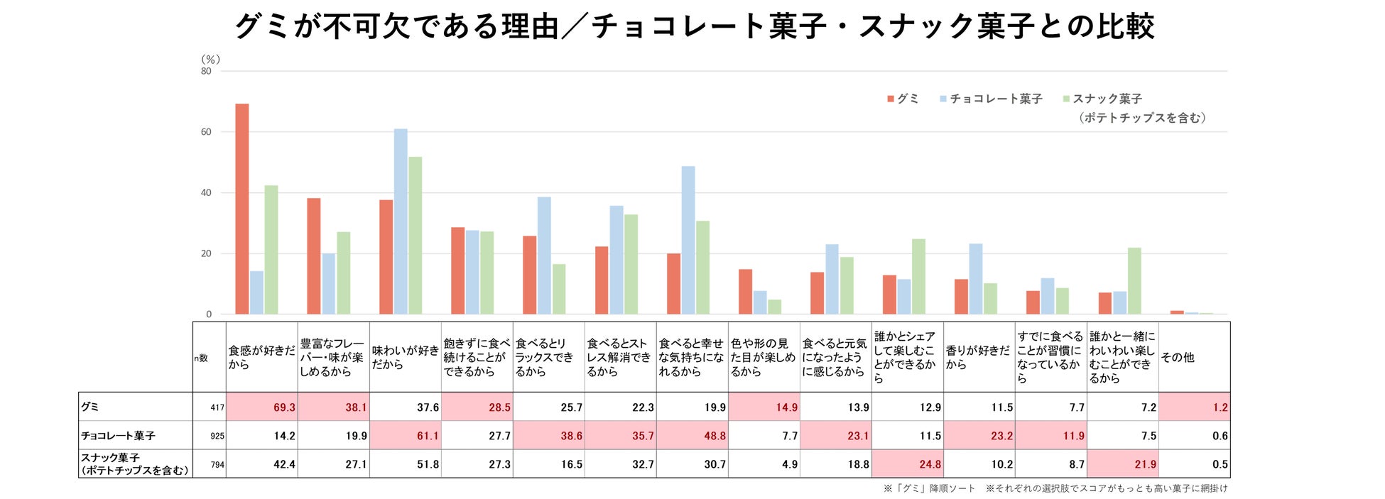 グミは「食感が好きだから」が約7割と、他カテゴリーと比較しても圧倒的なスコアの高さで理由に挙げられました。「豊富なフレーバー・味が楽しめるから」もグミの人気の理由のようですが、「食感」のスコアが突出しています。