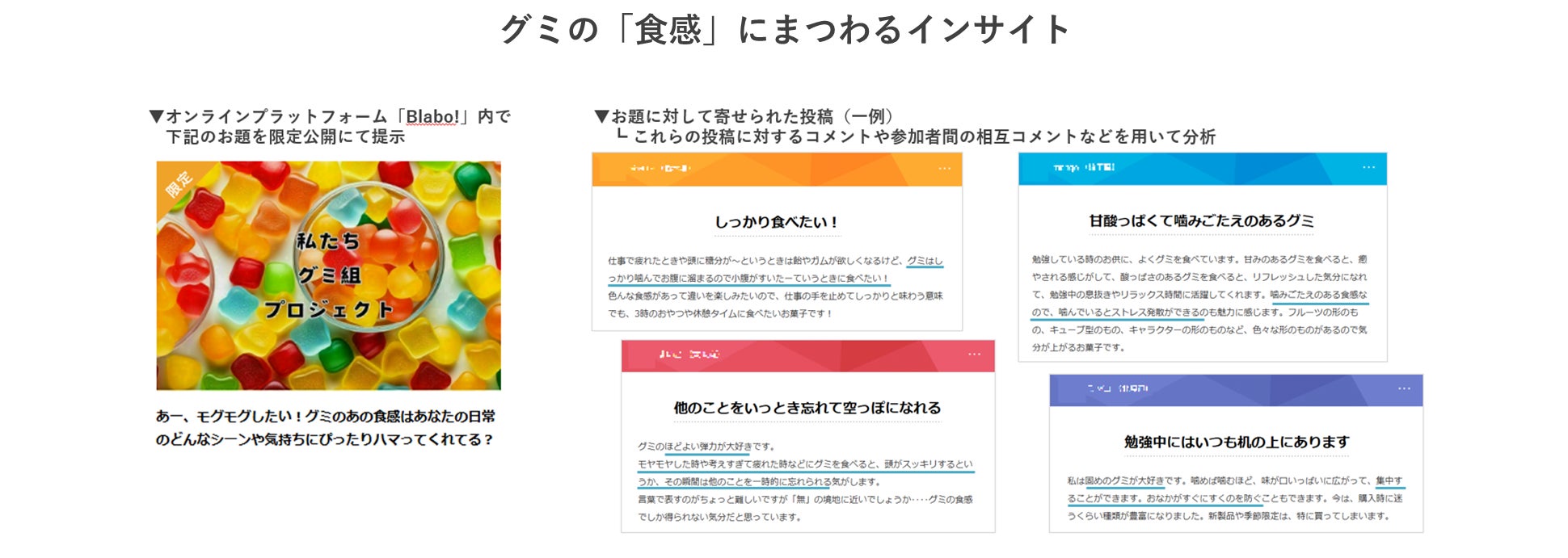 グミが生活に欠かせない理由の圧倒的1位となった「食感が好きだから」ですが、「その食感のためにグミが手放せない」と感じる背景や要因はどのようなものでしょうか。オンラインプラットフォーム「Blabo!」を活用して食感にまつわるインサイトを掘り下げてみました。