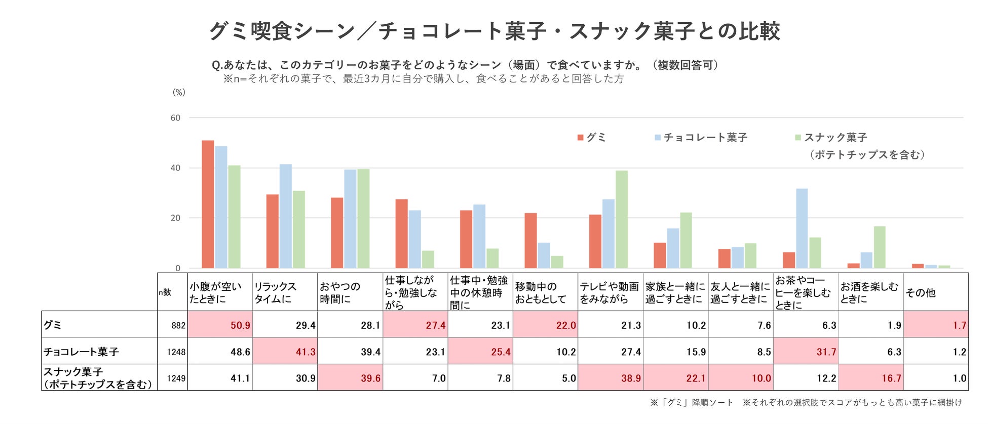 今回の調査では、「グミ」「チョコレート菓子」「スナック菓子(ポテトチップスを含む)」の愛用者(重複あり)に、それぞれの喫食実態をお伺いしています。まずは、各カテゴリーの喫食シーンを調査しました。