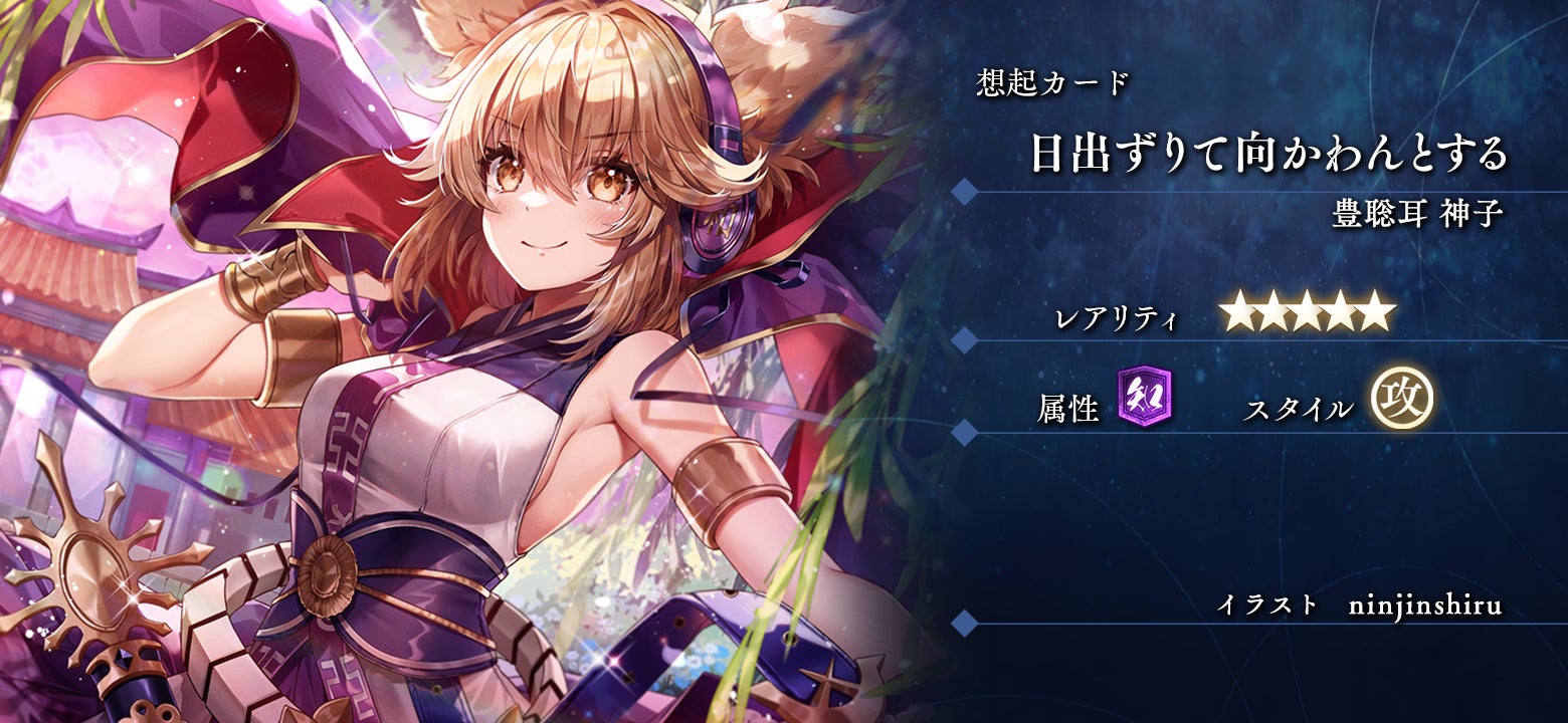 イベントで獲得できる、豊聡耳神子の想起カード『日出ずりて向かわんとする』は、ステージ中の[霊力]を5.0%UPさせ、[知]属性のキャラクターならさらに5.0%アップさせるパッシブスキル『無為自然の老荘思想』を持っています。