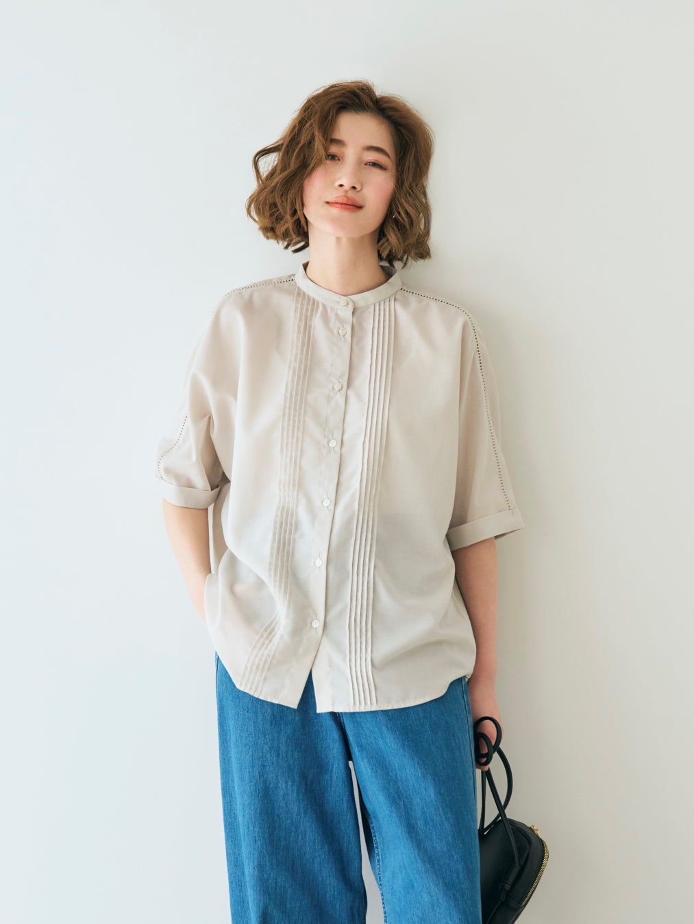 フロントにピンタックを施した端正なシャツデザインでありながら、あえてドルマンスリーブにすることでリラックス感を持たせた一着。