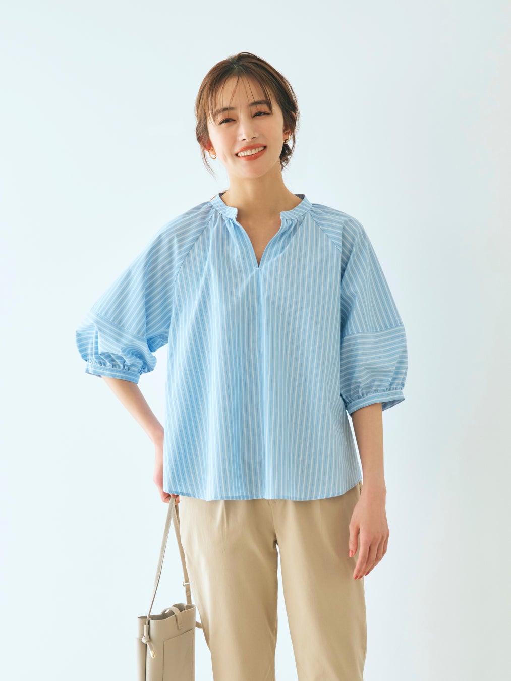 身体のラインを拾いにくい身頃のシルエットに、丸みのあるランタンスリーブが女性らしいデザインのブラウスです。肘が隠れる五分袖丈でロングシーズン使える上に、さらりとした肌触りがポイント。後ろ丈をやや長くすることで、タックアウトで着用した際に腰回りが綺麗に隠れます。